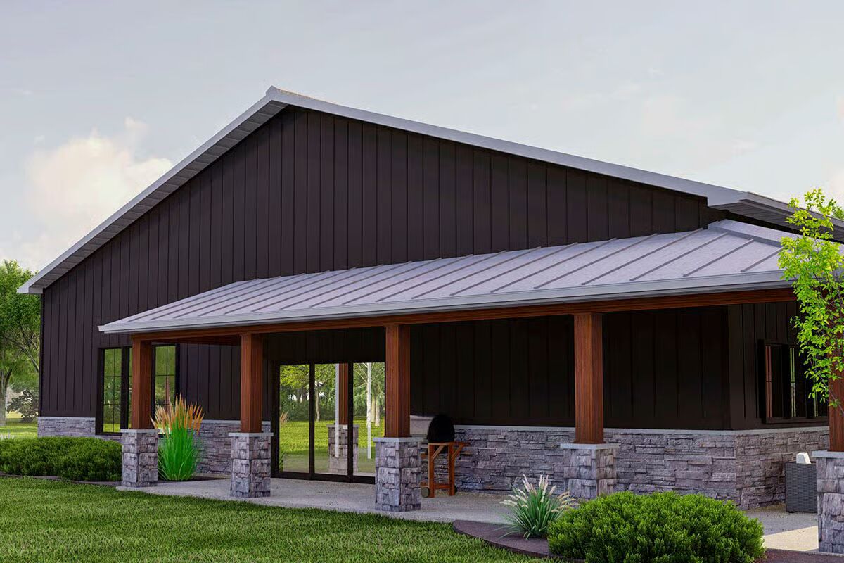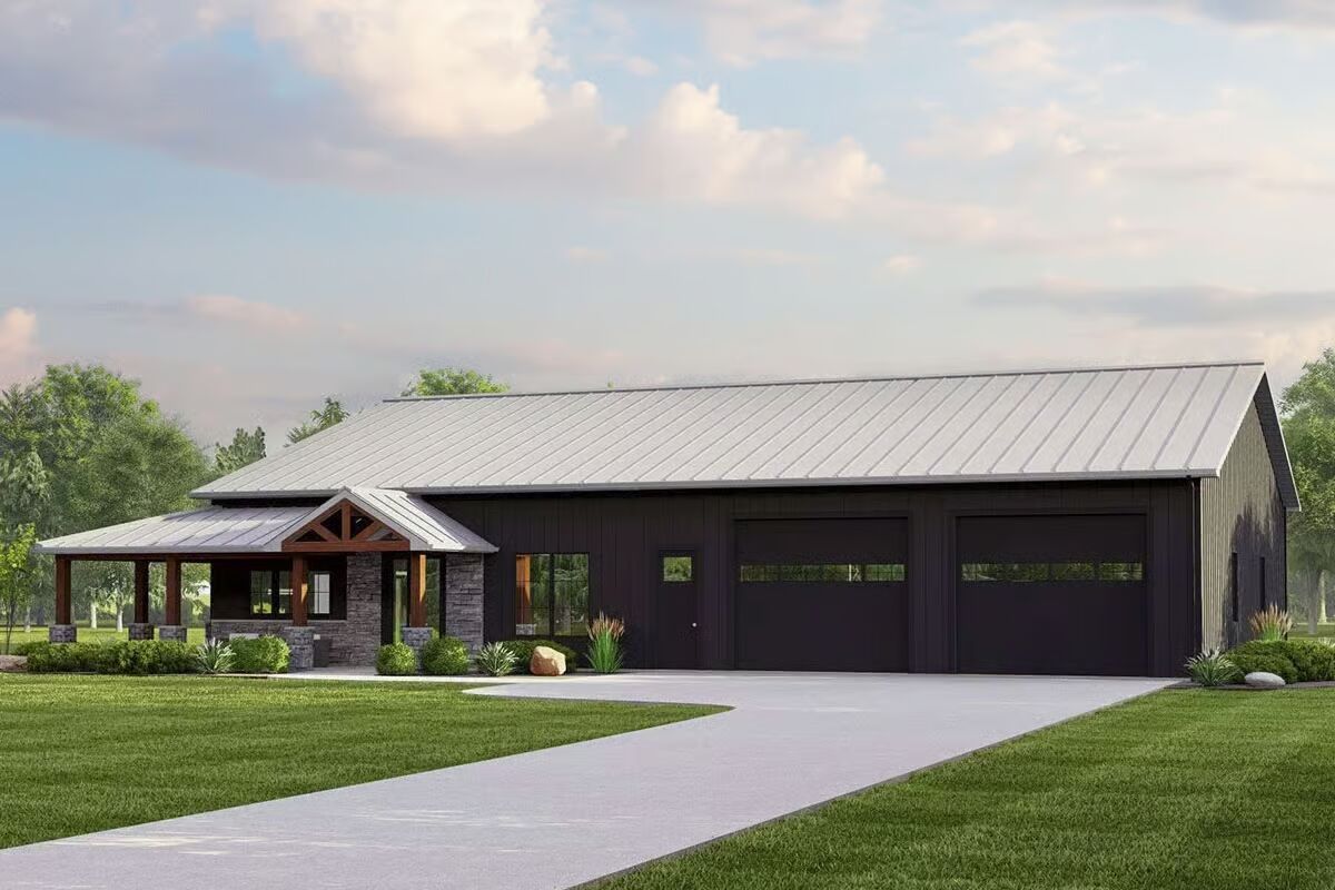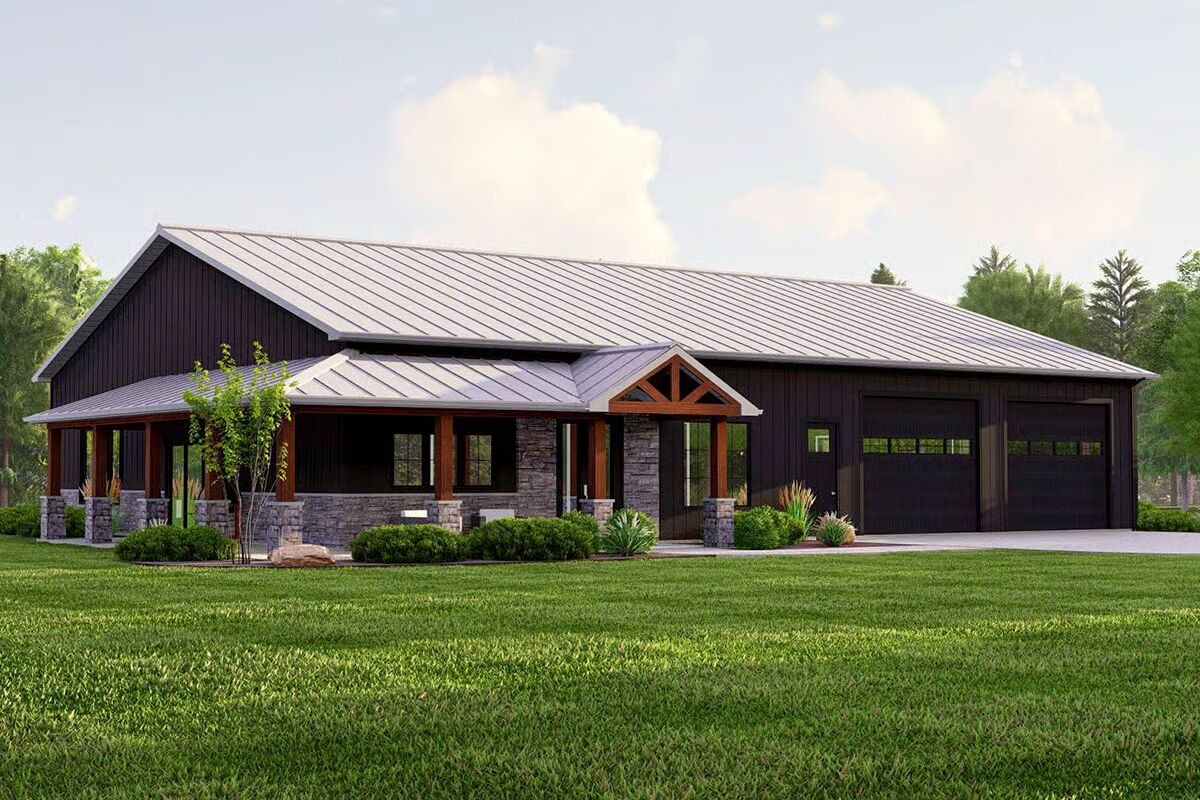 Experience the perfect balance of work and home life with this versatile 1-bedroom Barndominium plan, thoughtfully designed with durable 2×6 exterior walls. A charming wraparound porch and rain awning over the garage doors enhance its inviting curb appeal.