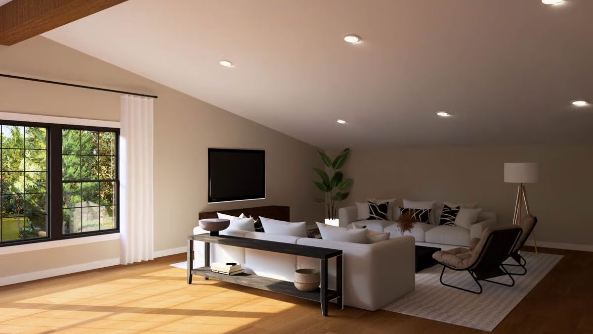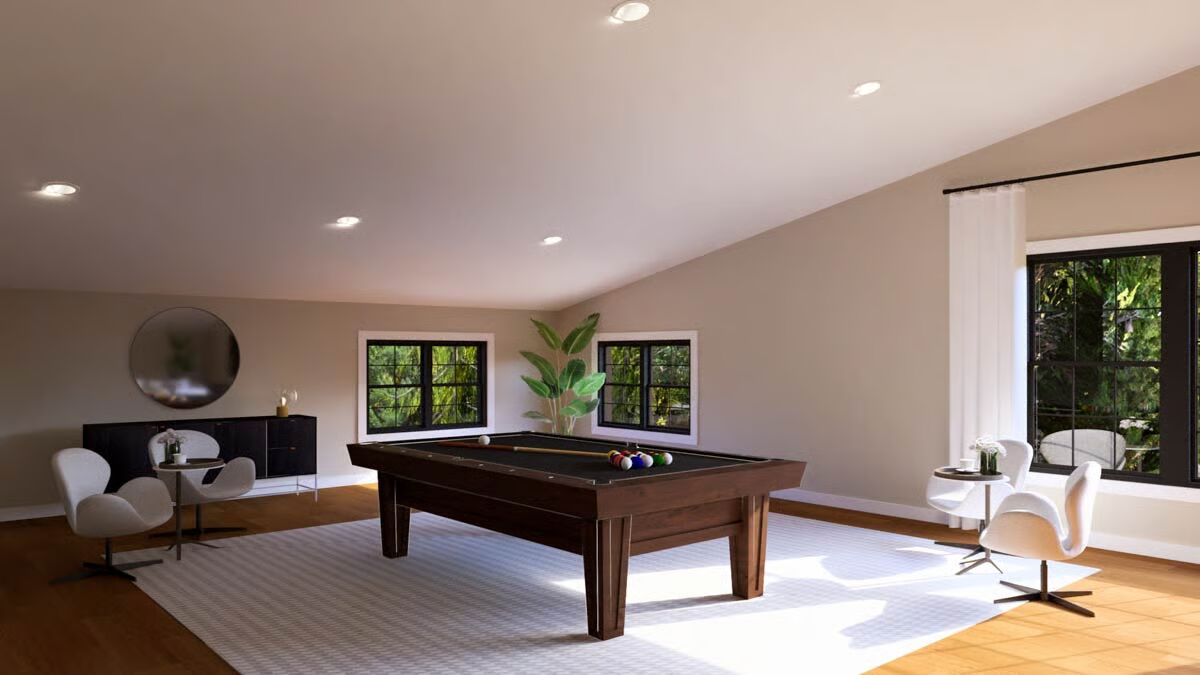 Tucked privately at the back of the home, the master suite offers a serene retreat with an ensuite bath and generous walk-in closet. Upstairs, a vaulted rec room provides endless possibilities for entertaining, gaming, or a flexible loft-style living space.