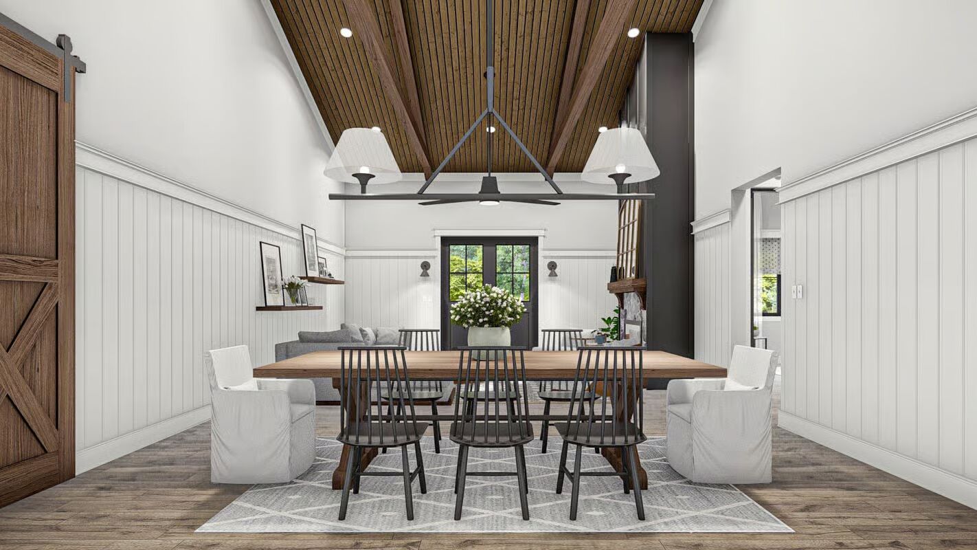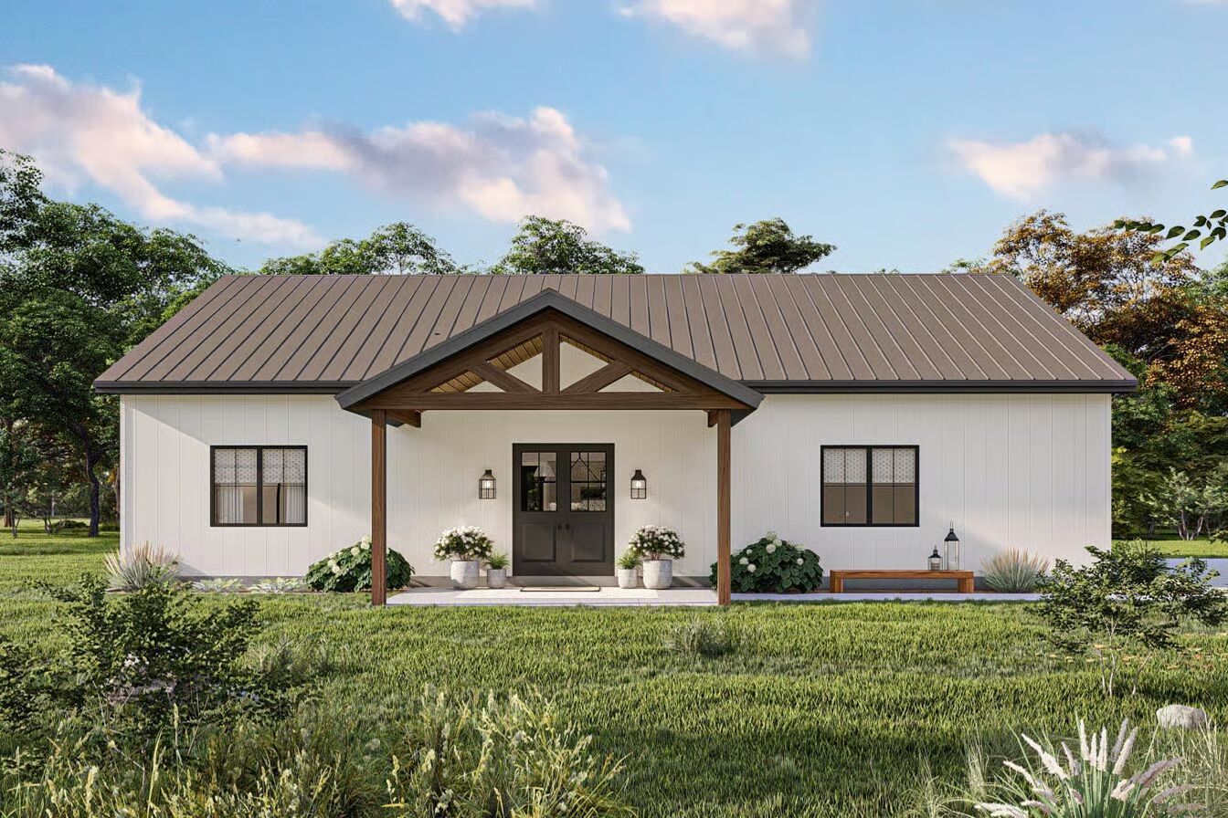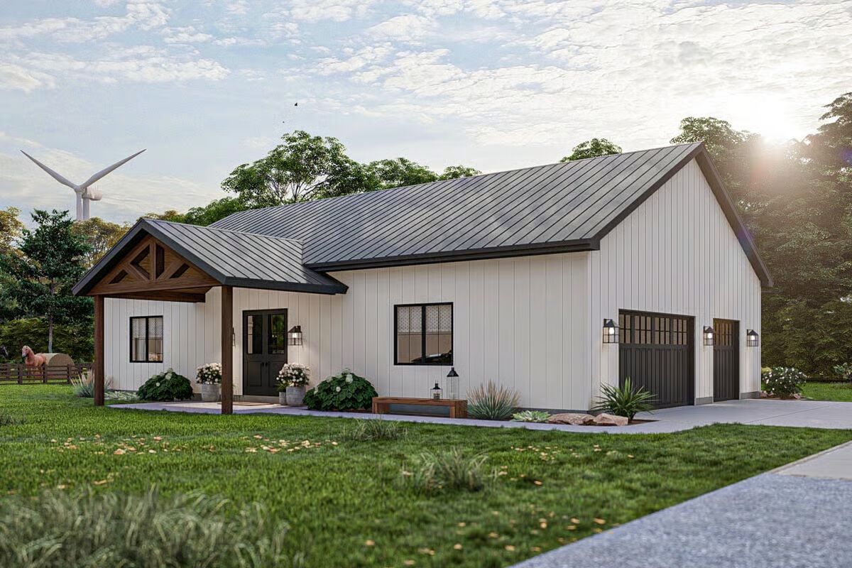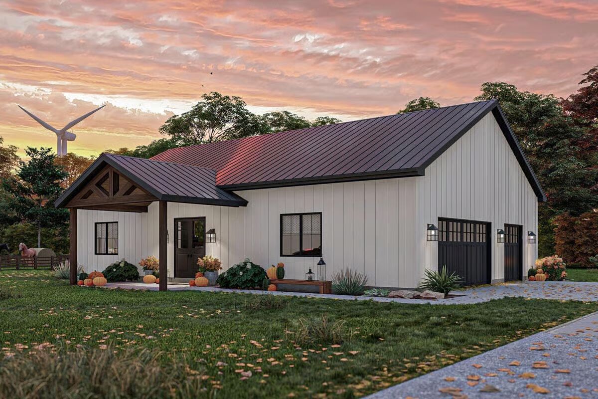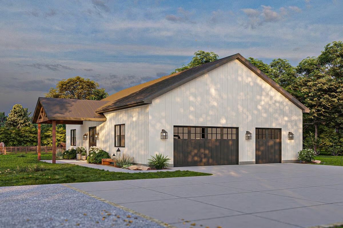 Buy This PlanThis striking Barndominium-style home features a bright white facade and a welcoming dark-wood timber porch.The modern Barndominium boasts a stylish white exterior, dark metal roof, and an attached two-car garage.This home includes a fantastic screened-in porch with wood beams, perfect for breezy outdoor dining.The combination of a metal roof and a large two-car garage provides a durable, modern look for this Barndominium.A side view showcases the vertical white siding and the expansive dark garage doors of the Barndominium.A stunning sunset glow highlights the clean lines and dark metal accents of this attractive Barndominium.The main entrance features a dramatic, vaulted wood-beam truss porch, setting a perfect farmhouse tone.The living room features a vaulted wood-slat ceiling, shiplap-style wainscoting, and a cozy modern fireplace.The open-concept dining area connects effortlessly to the living space under an eye-catching vaulted ceiling.Relax by the floor-to-ceiling stone-faced fireplace, flanked by comfortable chairs in this bright living area.A large farmhouse-style dining table anchors the center of this open space, with a kitchen visible beyond.High ceilings and a massive barn door create a bright, airy feel between the dining room and kitchen.Modern lantern pendant lights illuminate the stunning marble-top kitchen island, perfect for casual seating.The sleek kitchen features gray cabinetry, a marble waterfall island, and a decorative tile backsplash.A calm retreat, the secondary bedroom includes a wood-slat ceiling, rich wood floors, and warm, neutral tones.The main bedroom offers a beautiful blend of rustic and contemporary with a canopy bed and a sliding barn door.This dedicated home office includes built-in cabinetry, a long marble desk, and warm accent lighting.The office space is thoughtfully designed with a comfortable chair and a window overlooking the scenic outdoors.The main bathroom offers a luxurious soaking tub and a spacious double vanity with dark wood cabinets.Enjoy the clean design of the guest bathroom, featuring a glass walk-in shower and a free-standing tub.