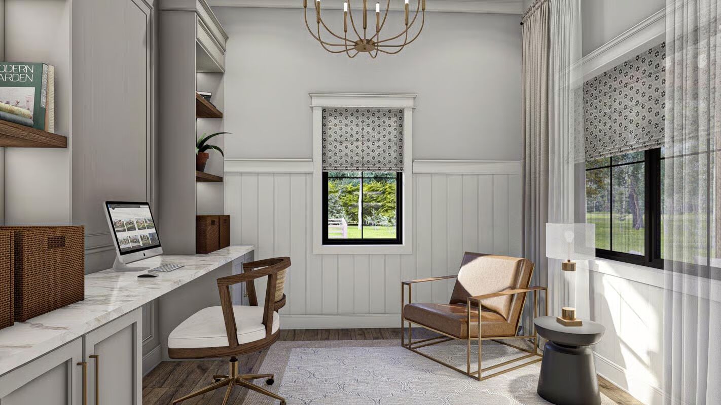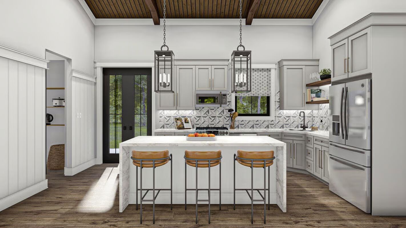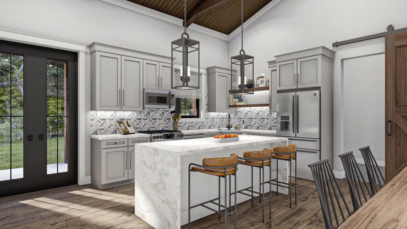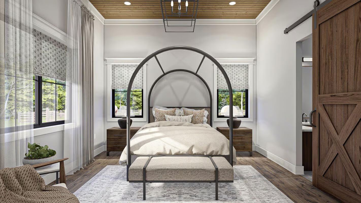 Buy This PlanThis striking Barndominium-style home features a bright white facade and a welcoming dark-wood timber porch.The modern Barndominium boasts a stylish white exterior, dark metal roof, and an attached two-car garage.This home includes a fantastic screened-in porch with wood beams, perfect for breezy outdoor dining.The combination of a metal roof and a large two-car garage provides a durable, modern look for this Barndominium.A side view showcases the vertical white siding and the expansive dark garage doors of the Barndominium.A stunning sunset glow highlights the clean lines and dark metal accents of this attractive Barndominium.The main entrance features a dramatic, vaulted wood-beam truss porch, setting a perfect farmhouse tone.The living room features a vaulted wood-slat ceiling, shiplap-style wainscoting, and a cozy modern fireplace.The open-concept dining area connects effortlessly to the living space under an eye-catching vaulted ceiling.Relax by the floor-to-ceiling stone-faced fireplace, flanked by comfortable chairs in this bright living area.A large farmhouse-style dining table anchors the center of this open space, with a kitchen visible beyond.High ceilings and a massive barn door create a bright, airy feel between the dining room and kitchen.Modern lantern pendant lights illuminate the stunning marble-top kitchen island, perfect for casual seating.The sleek kitchen features gray cabinetry, a marble waterfall island, and a decorative tile backsplash.A calm retreat, the secondary bedroom includes a wood-slat ceiling, rich wood floors, and warm, neutral tones.The main bedroom offers a beautiful blend of rustic and contemporary with a canopy bed and a sliding barn door.This dedicated home office includes built-in cabinetry, a long marble desk, and warm accent lighting.The office space is thoughtfully designed with a comfortable chair and a window overlooking the scenic outdoors.The main bathroom offers a luxurious soaking tub and a spacious double vanity with dark wood cabinets.Enjoy the clean design of the guest bathroom, featuring a glass walk-in shower and a free-standing tub.