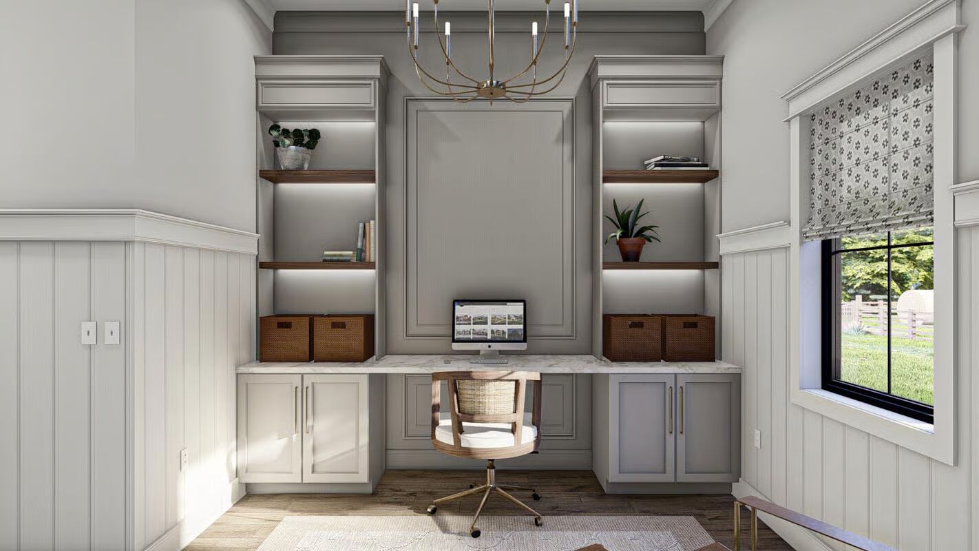 A private home office, complete with a closet and convenient access to the powder room, provides a quiet space to work or unwind.