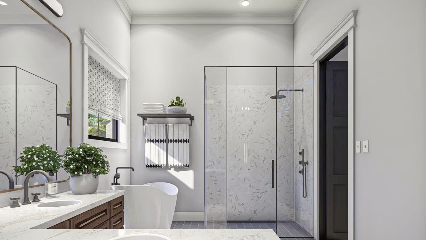 The master suite serves as a peaceful escape, featuring a spacious walk-in shower and elegant finishes throughout.