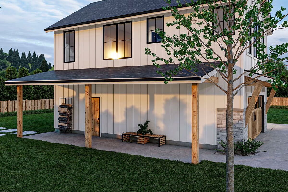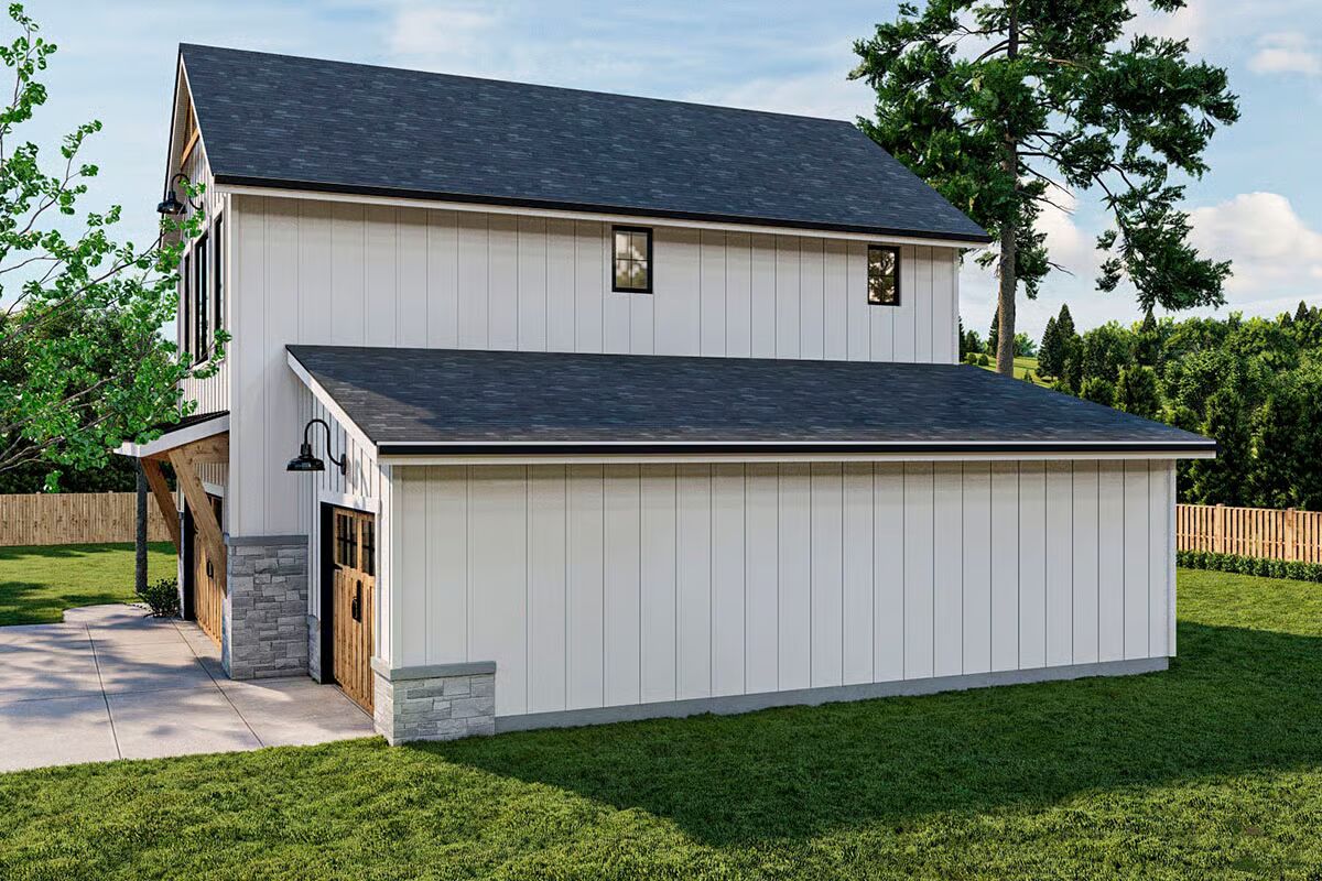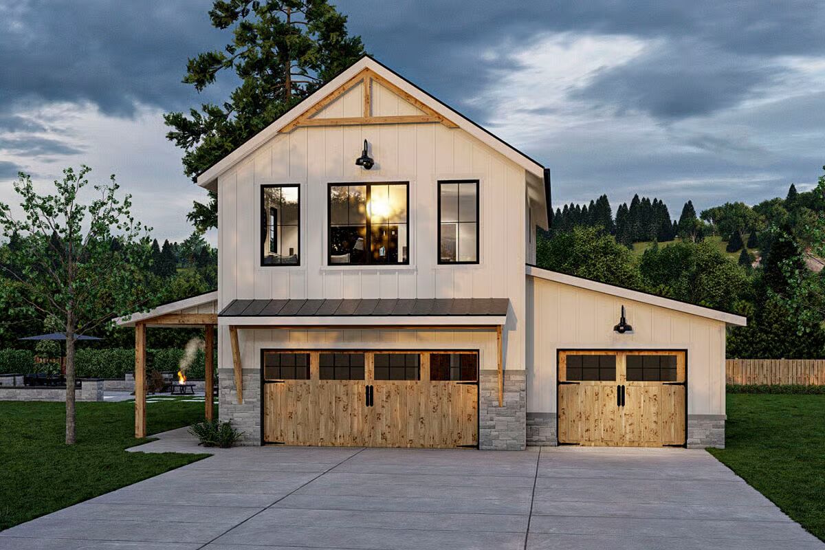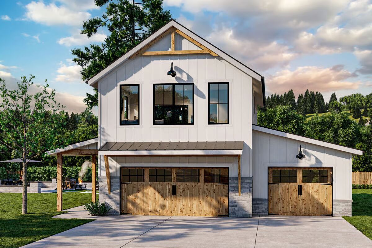 Blending New American style with Barndominium charm, this stunning two-story carriage house plan combines modern functionality with timeless appeal.
