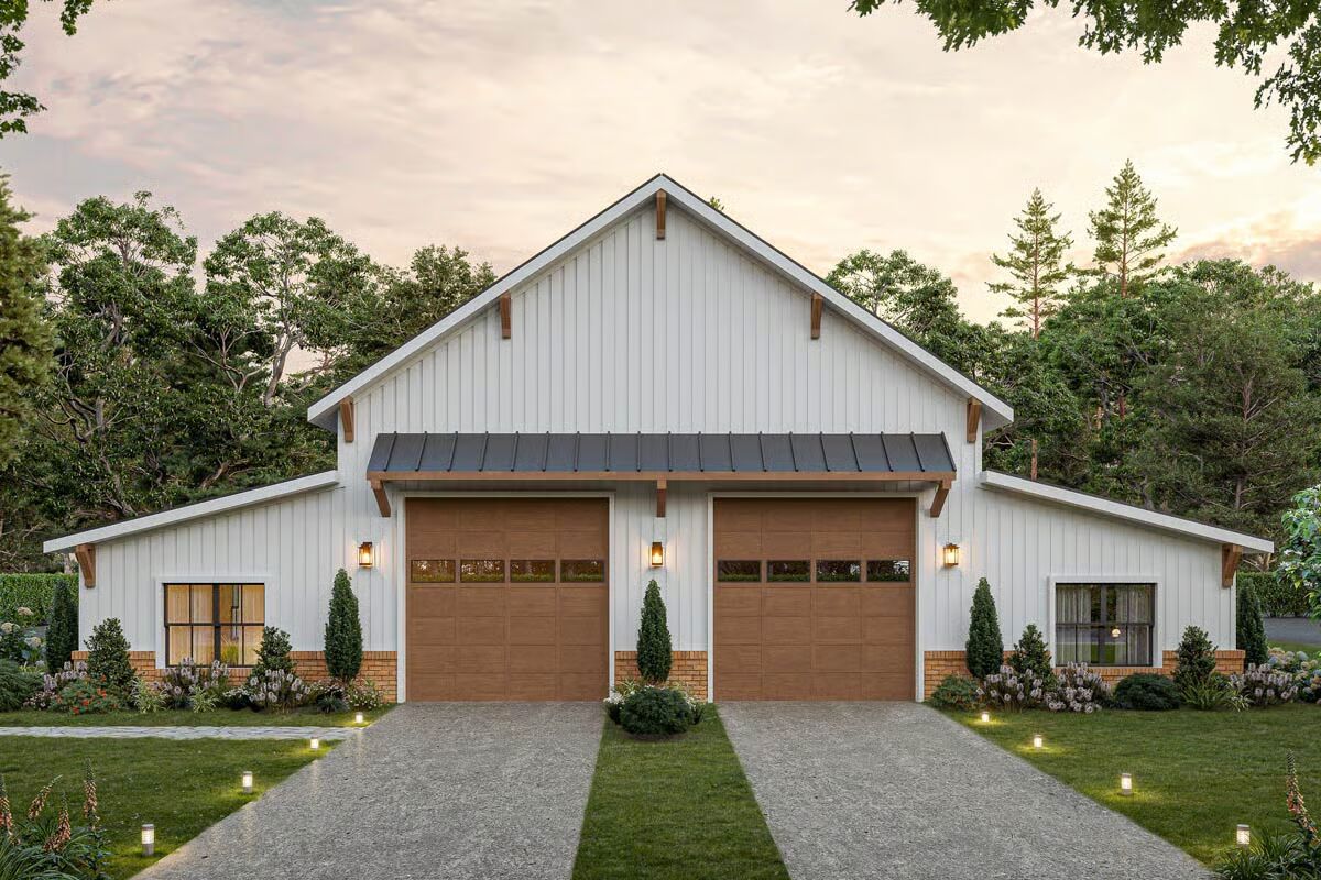 A crisp white board-and-batten façade paired with a dark metal roof creates a striking exterior presence.