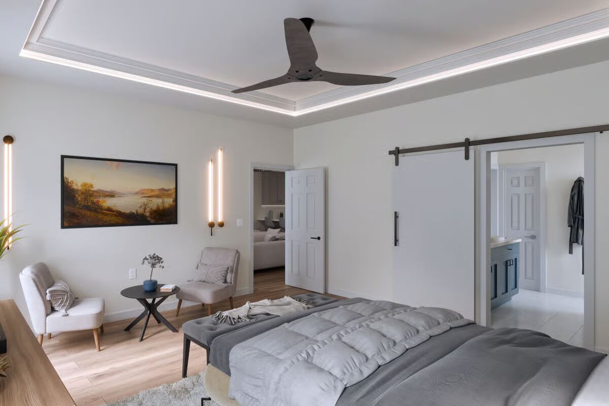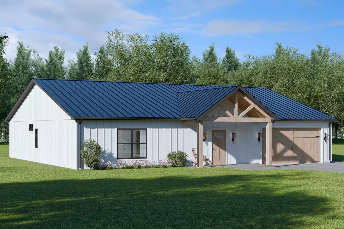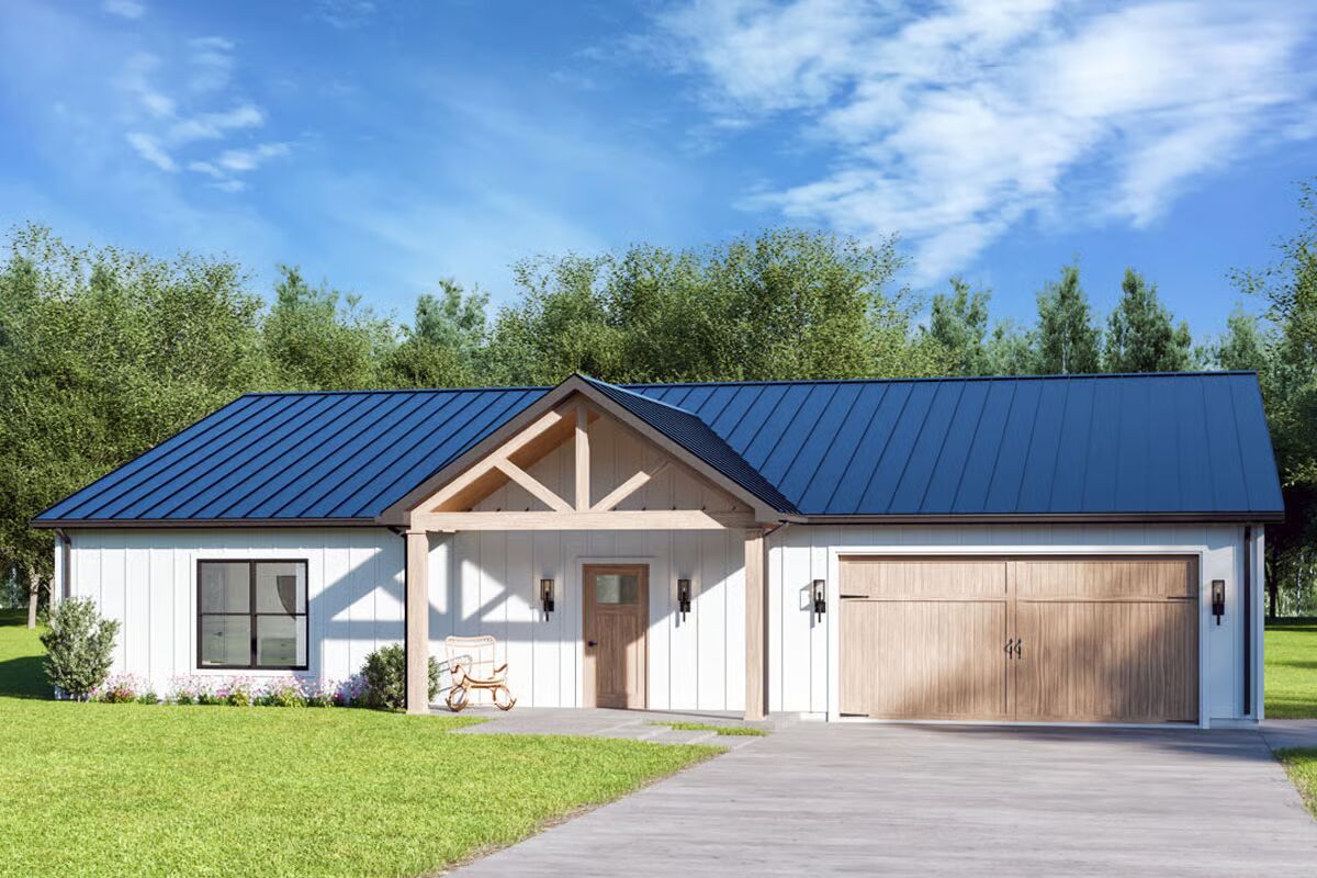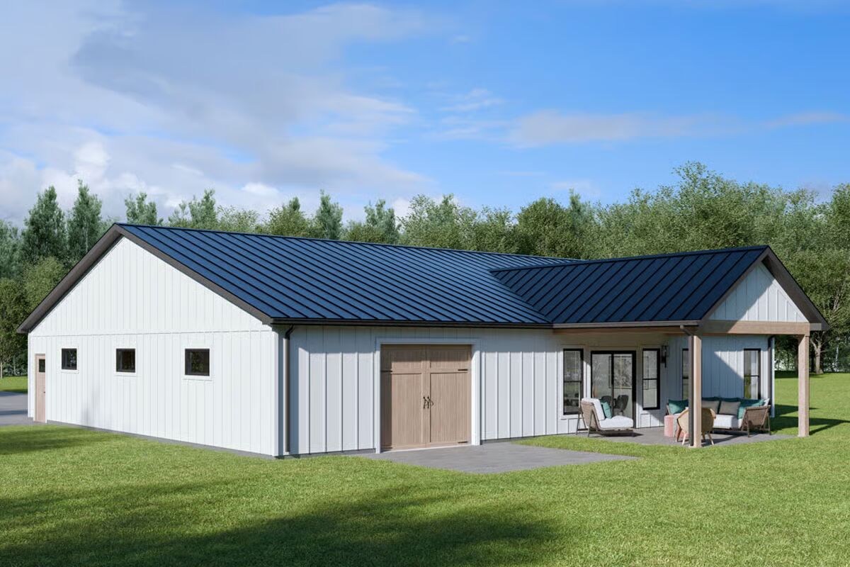 Buy This PlanA welcoming front porch with natural wood accents and classic barn-style garage doors highlights the modern farmhouse aesthetic of this beautiful barndominium.This stylish barndominium features a striking deep blue metal roof and clean, white vertical siding, combining rustic charm with modern elegance.The home’s rear exterior reveals a seamless blend of indoor and outdoor living with a covered patio, ideal for entertaining or enjoying a quiet afternoon.The back of the home shows off a charming covered patio and a large, accessible garage, perfect for both relaxing and storing equipment.From this angle, you can see how the open layout connects the living room to the dining and kitchen areas, making the space feel expansive and perfect for gathering.The living room showcases an open floor plan with a soaring vaulted ceiling and exposed beams, creating a bright and airy central space.A unique built-in shelving unit anchors the dining area, offering a stylish and practical way to display books and decor while transitioning into the main living space.This inviting kitchen and dining room features warm-toned cabinetry, a spacious central island, and modern appliances, all within a light-filled, open-concept design.This master suite combines luxury and function with a sophisticated tray ceiling, elegant lighting fixtures, and a sleek barn door leading to the ensuite bathroom.The bedroom provides a serene retreat with a calming neutral color palette, large window, and minimalist decor, creating a peaceful and restful atmosphere.This stylish bathroom features a dual-sink vanity with a rich blue finish, complemented by unique mirrors and modern globe pendant lights.The master bath includes a sleek, glass-enclosed shower with contemporary concrete-style tiling, offering a spa-like feel.