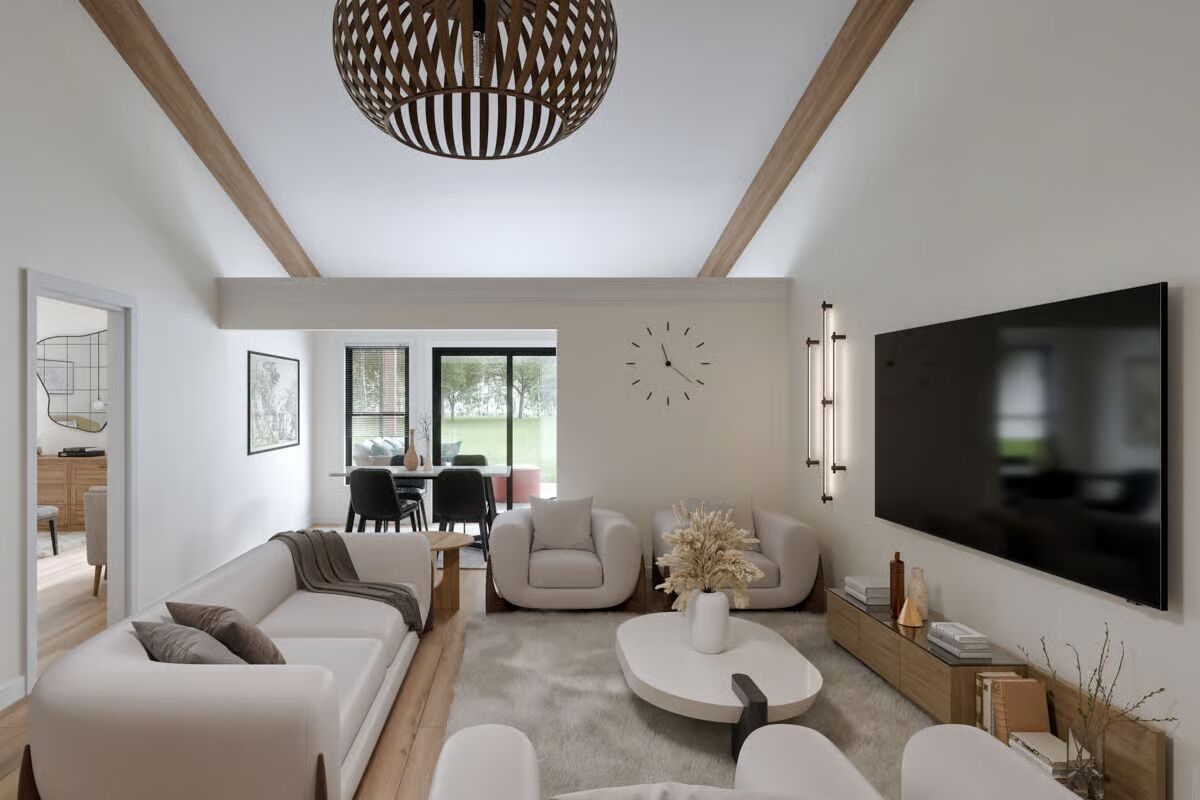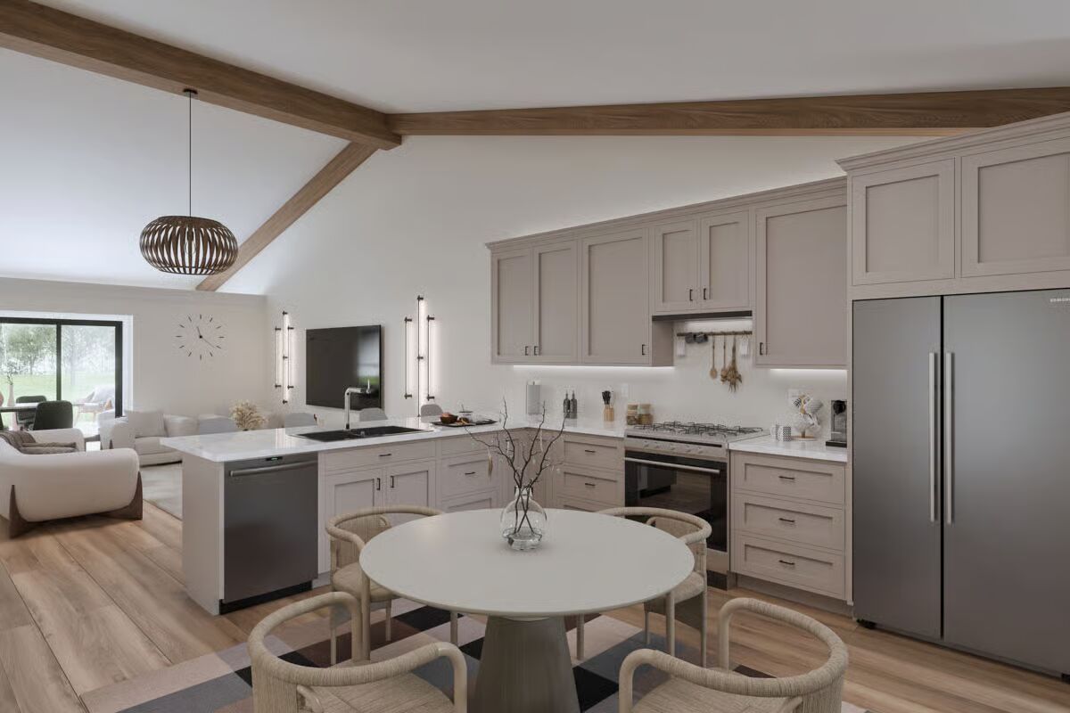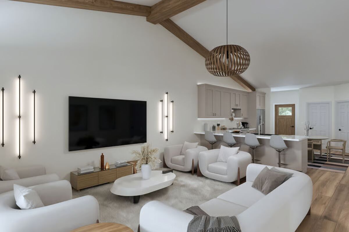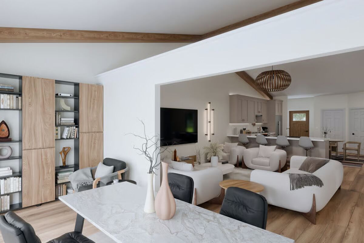 Buy This PlanA welcoming front porch with natural wood accents and classic barn-style garage doors highlights the modern farmhouse aesthetic of this beautiful barndominium.This stylish barndominium features a striking deep blue metal roof and clean, white vertical siding, combining rustic charm with modern elegance.The home’s rear exterior reveals a seamless blend of indoor and outdoor living with a covered patio, ideal for entertaining or enjoying a quiet afternoon.The back of the home shows off a charming covered patio and a large, accessible garage, perfect for both relaxing and storing equipment.From this angle, you can see how the open layout connects the living room to the dining and kitchen areas, making the space feel expansive and perfect for gathering.The living room showcases an open floor plan with a soaring vaulted ceiling and exposed beams, creating a bright and airy central space.A unique built-in shelving unit anchors the dining area, offering a stylish and practical way to display books and decor while transitioning into the main living space.This inviting kitchen and dining room features warm-toned cabinetry, a spacious central island, and modern appliances, all within a light-filled, open-concept design.This master suite combines luxury and function with a sophisticated tray ceiling, elegant lighting fixtures, and a sleek barn door leading to the ensuite bathroom.The bedroom provides a serene retreat with a calming neutral color palette, large window, and minimalist decor, creating a peaceful and restful atmosphere.This stylish bathroom features a dual-sink vanity with a rich blue finish, complemented by unique mirrors and modern globe pendant lights.The master bath includes a sleek, glass-enclosed shower with contemporary concrete-style tiling, offering a spa-like feel.