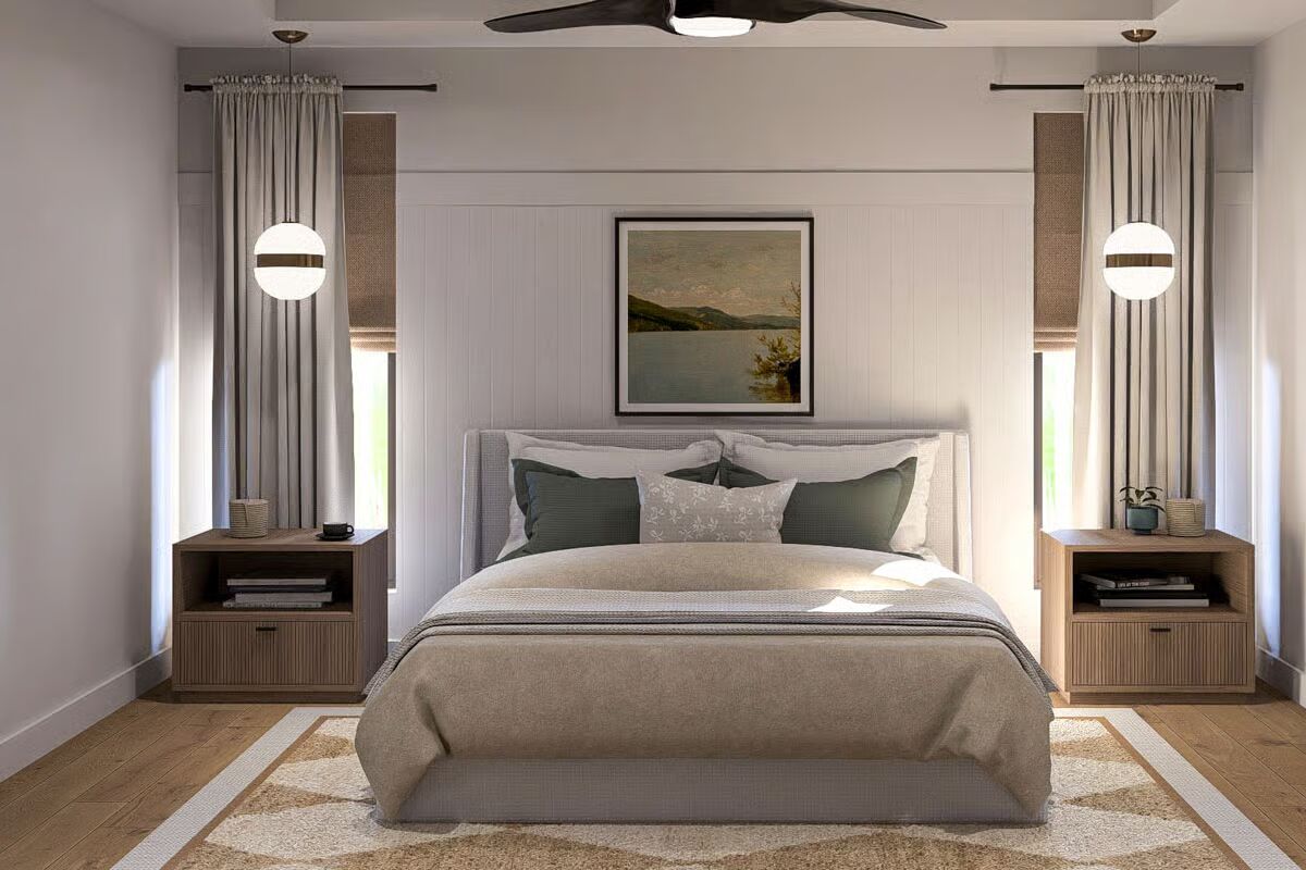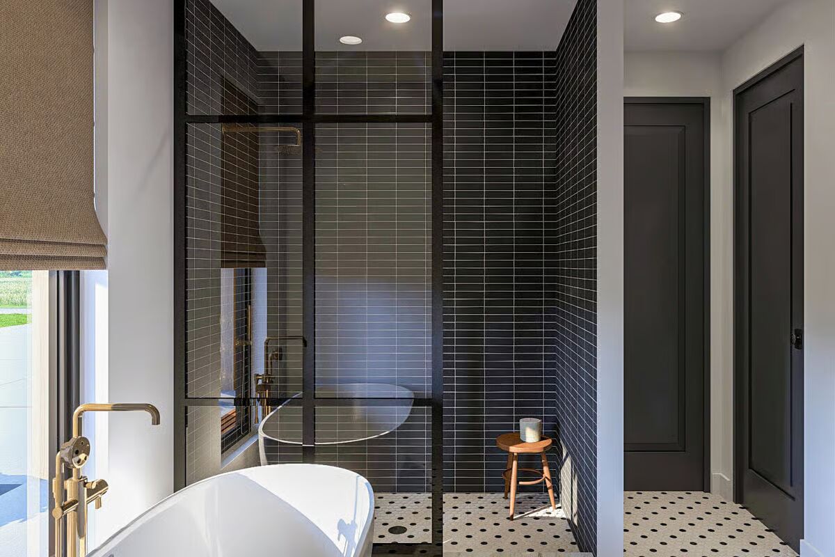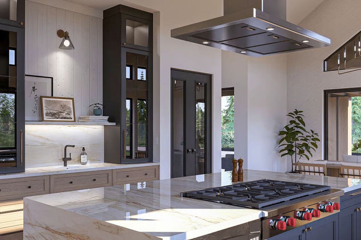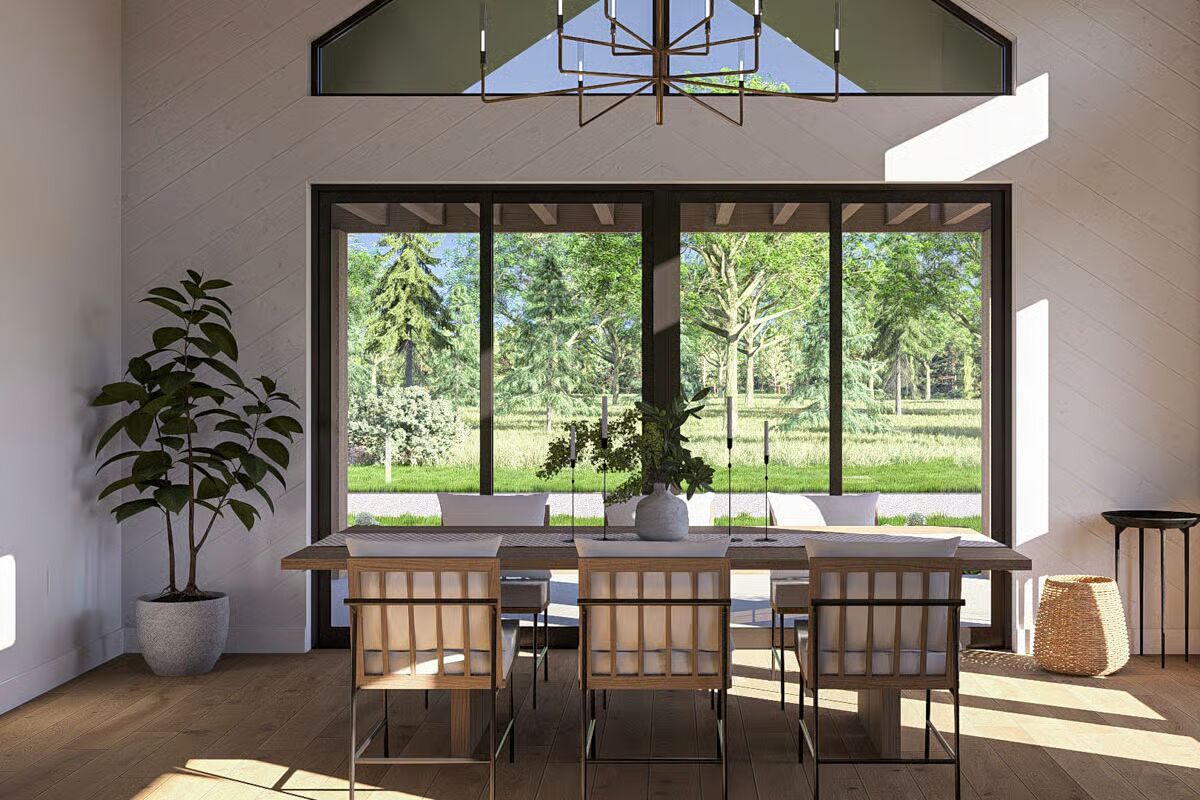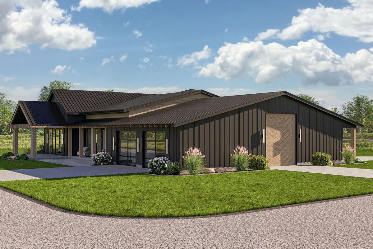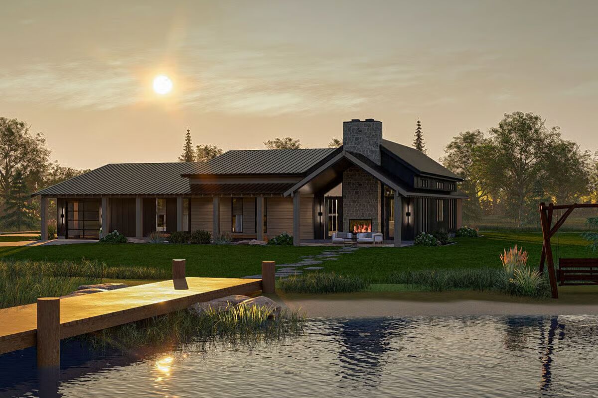 The striking Barndominium facade greets you with a covered porch, gabled entry, and a modern, integrated garage door.This view showcases the Barndominium’s expansive, modern facade with dark vertical siding and a continuous covered porch.A close-up highlights the Barndominium’s welcoming covered entrance with natural wood accents and clean lines.This angle captures the Barndominium’s dramatic gabled entry and retractable glass wall leading to the interior.The stunning Barndominium is perfectly framed by a lakeside sunset and a private wooden dock.The Barndominium features a sleek side profile with a stone chimney and an inviting covered outdoor lounge space.The Barndominium’s front elevation displays an appealing mix of light wood and dark metal, complete with a covered porch and garage area.A stone path leads across the manicured lawn to the Barndominium’s outdoor fireplace area, combining rugged and modern styles.The attached garage and main structure of the Barndominium are visible, showcasing the modern vertical dark siding.A modern entry is marked by black double glass doors, bringing natural light and a view of the outdoors into the home.The striking living room features a vaulted ceiling, a soaring stone fireplace, and twin glass doors flanking the hearth.An open-concept view connects the dining area, gourmet kitchen, and a glimpse of the vaulted-ceiling living space.The bright dining area features a modern table and chairs, set against a large glass door offering expansive views of the outdoors.A sophisticated transition space highlights the dining area with a modern chandelier and a view into the stylish kitchen and back porch.The sleek kitchen island with a waterfall edge is perfectly positioned beneath a modern hood, overlooking a stunning panoramic window.This close-up of the kitchen shows the high-end range and stone countertop, complemented by dark cabinetry and a prep sink.This image showcases a charming hallway with a gallery wall, leading past the dining area toward an interior door.The primary bedroom is a serene retreat with light wood floors, a cozy rug, and dual pendant lighting fixtures.The bedroom wall features a built-in entertainment center with a wet bar and mini-fridge for ultimate convenience.The luxurious primary bathroom features a freestanding tub and a dramatic walk-in shower encased in dark subway tile.This elegant vanity area has dual sinks, a marble countertop, and gold-framed mirrors with modern wall sconces.