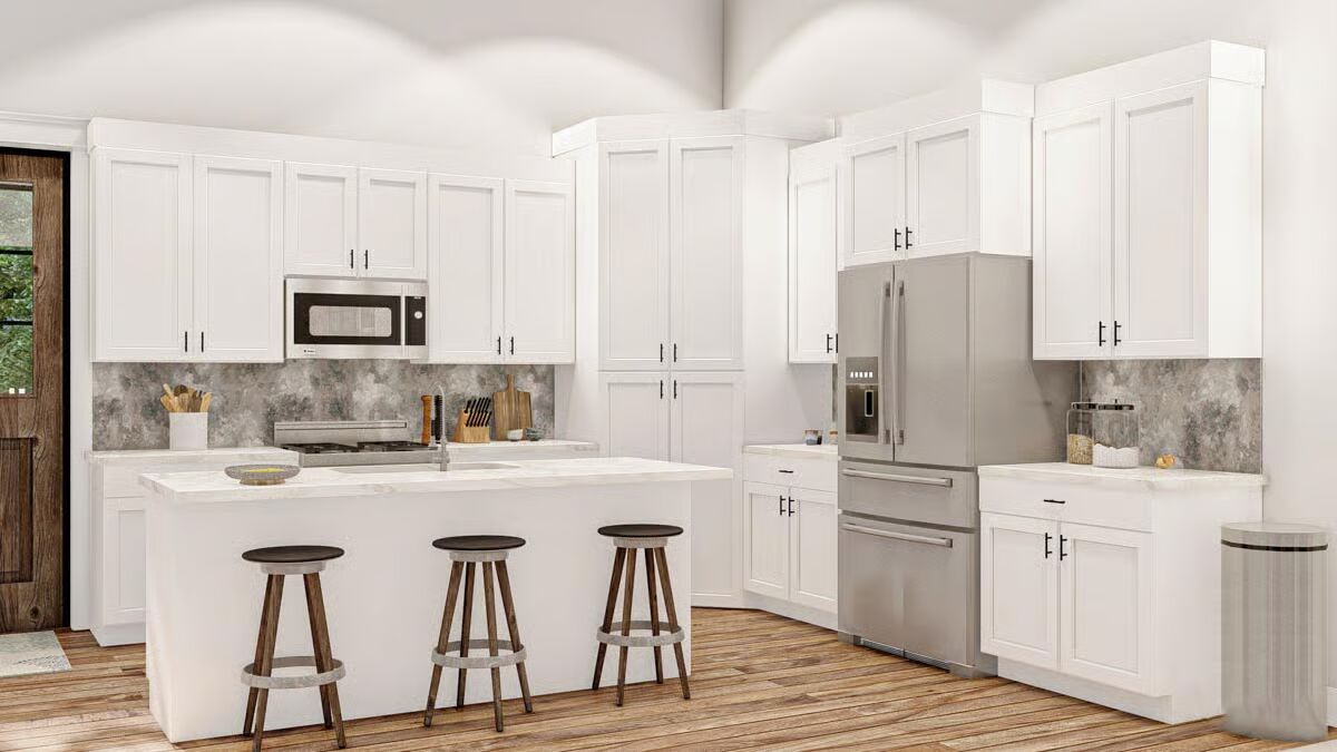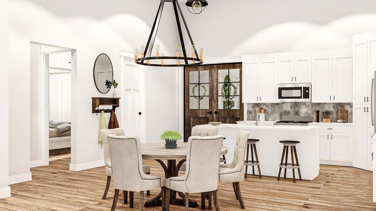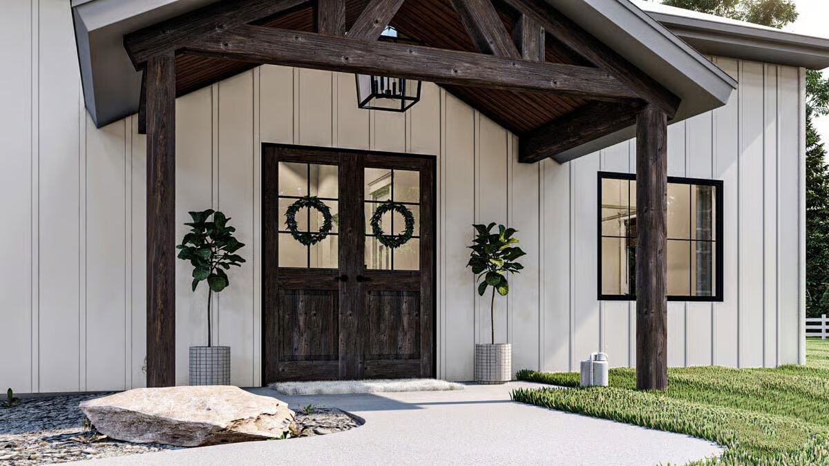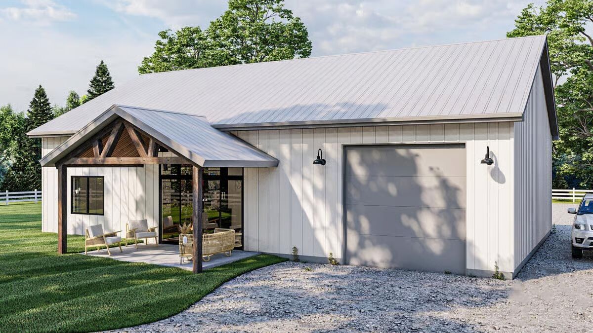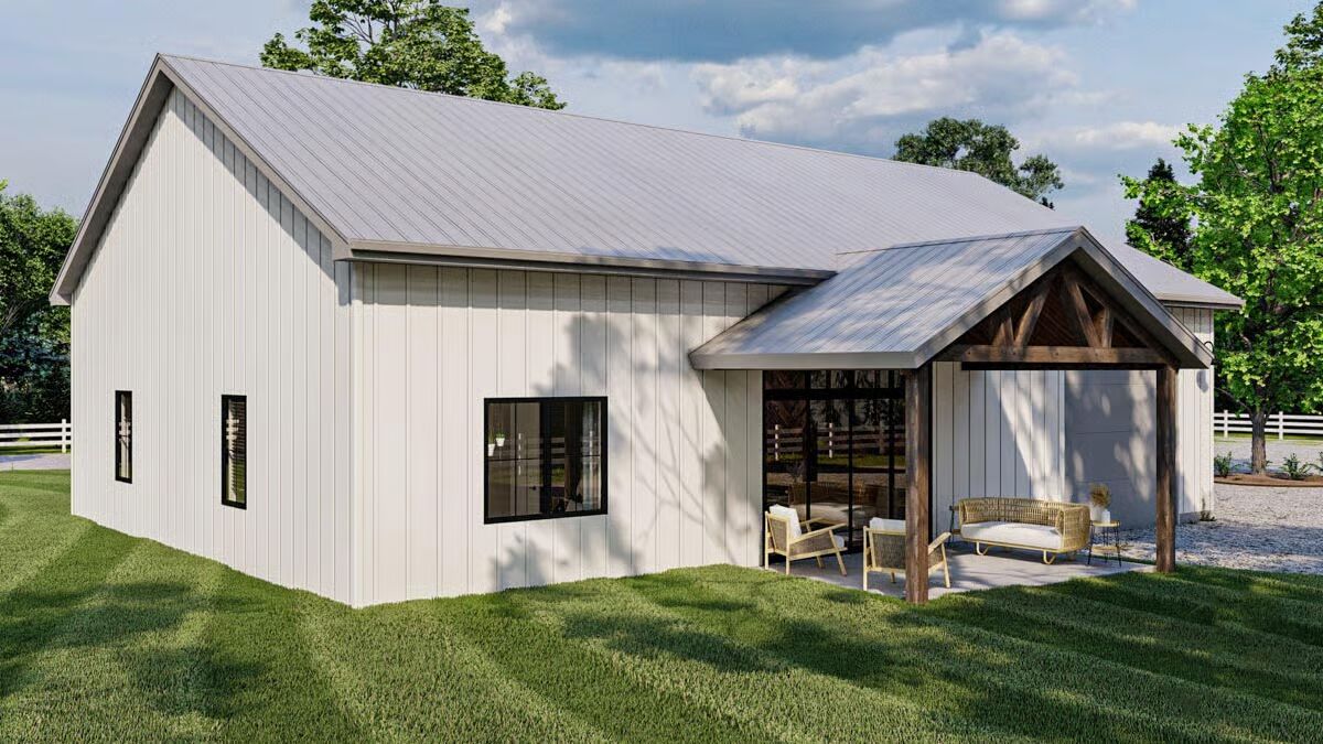 Buy This PlanThis modern barndominium-style home combines a classic barn look with sleek, contemporary details and an inviting entryway.A great view of the home’s side, showing off the large garage door and the clean lines of the metal roof and white siding.This angle highlights a second entrance, leading to an outdoor patio with seating for relaxing in the fresh air.From the back, you can see the seamless blend of the home’s various sections, all tied together by a consistent modern farmhouse style.The rustic front doors, with their large windows and simple wreaths, create a warm and welcoming focal point.The dining area offers a casual and inviting space for meals, complete with a round table and a unique circular chandelier.This kitchen is a study in modern simplicity, with bright white cabinets, a large island, and a sleek, industrial backsplash.The living room features a striking brick fireplace flanked by built-in cabinets with decorative wallpaper, making for a cozy and stylish entertainment space.A cozy living area stands out with a stunning wood accent wall in a chevron pattern that adds rich texture and a rustic feel.The bedroom is a serene retreat, with a minimalist four-poster bed and natural light that creates a bright, airy feel.