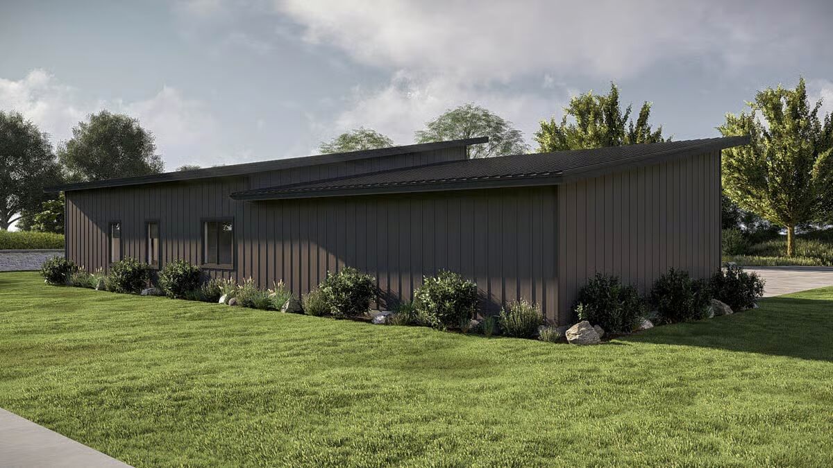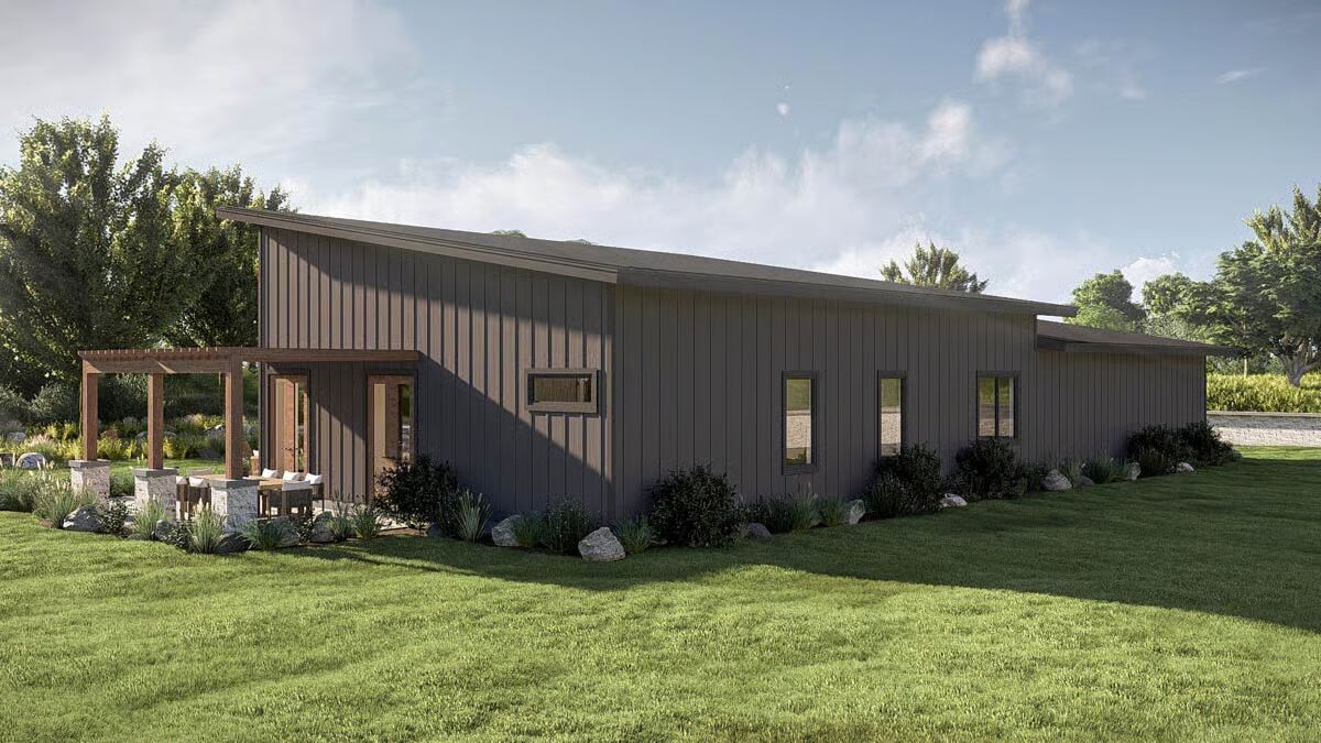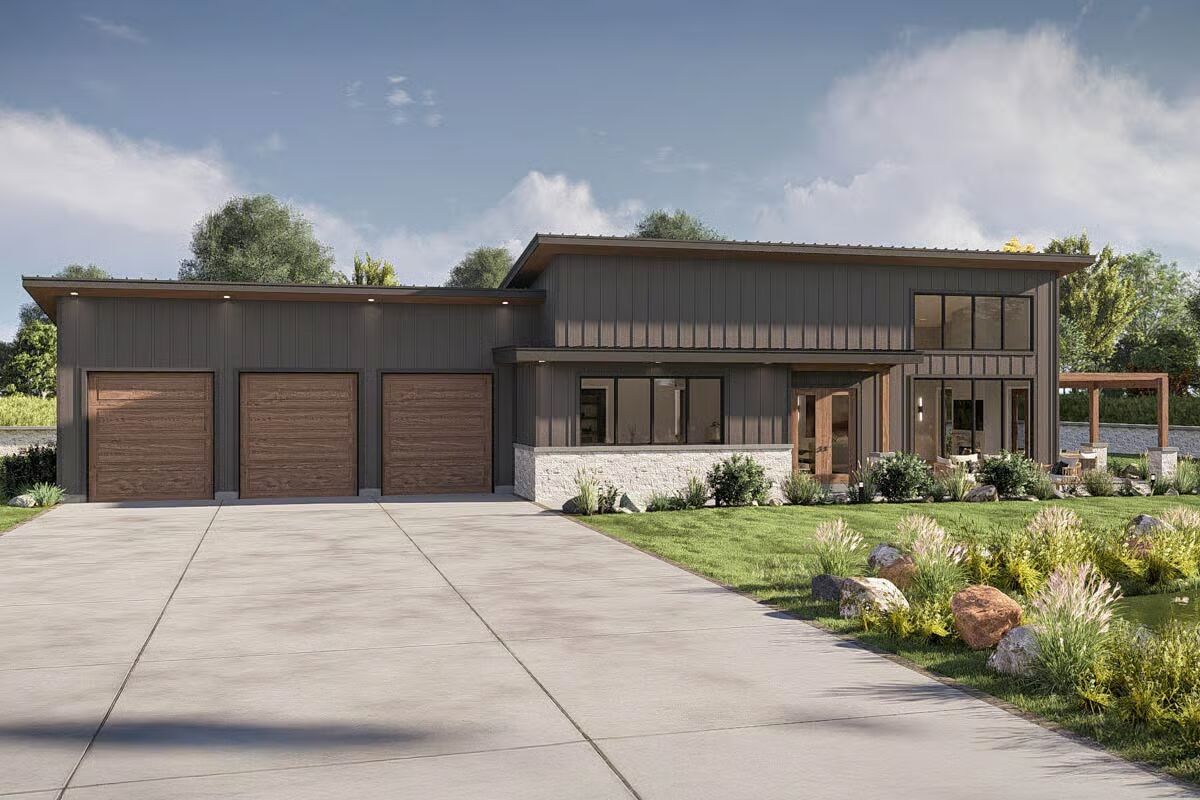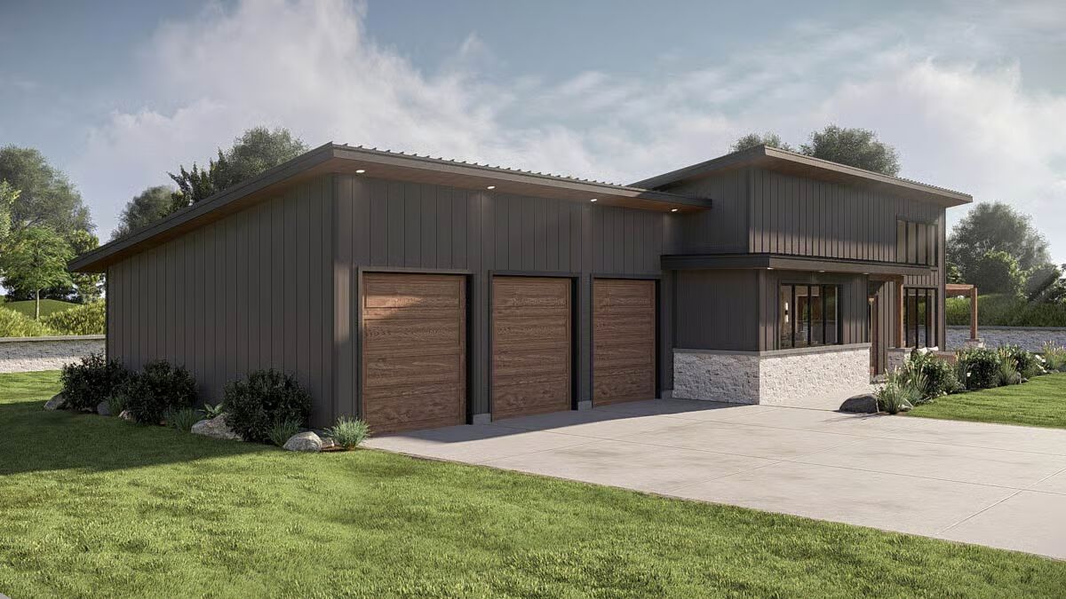 Introducing a striking 1,651 sq. ft. Contemporary Barndominium, showcasing 2 bedrooms, 2 full bathrooms, and an impressive 1,059 sq. ft. 3-car garage, all wrapped in a sleek exterior of dark vertical siding complemented by natural stone accents for exceptional curb appeal.