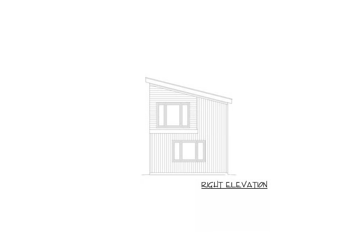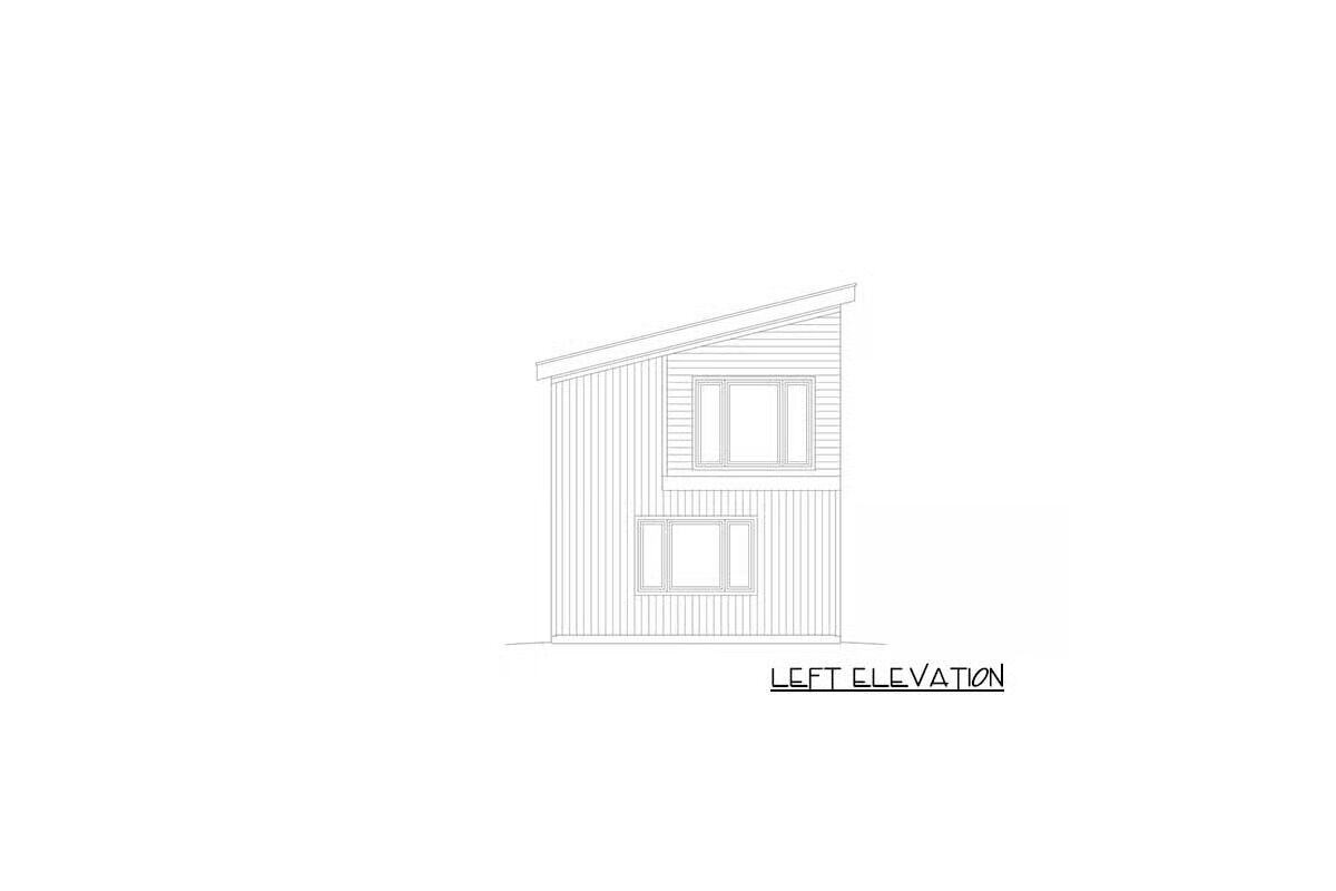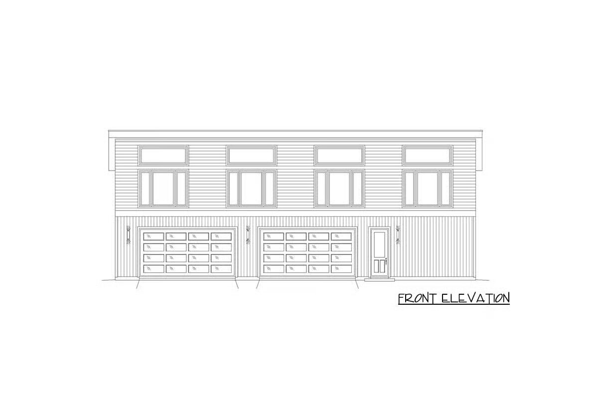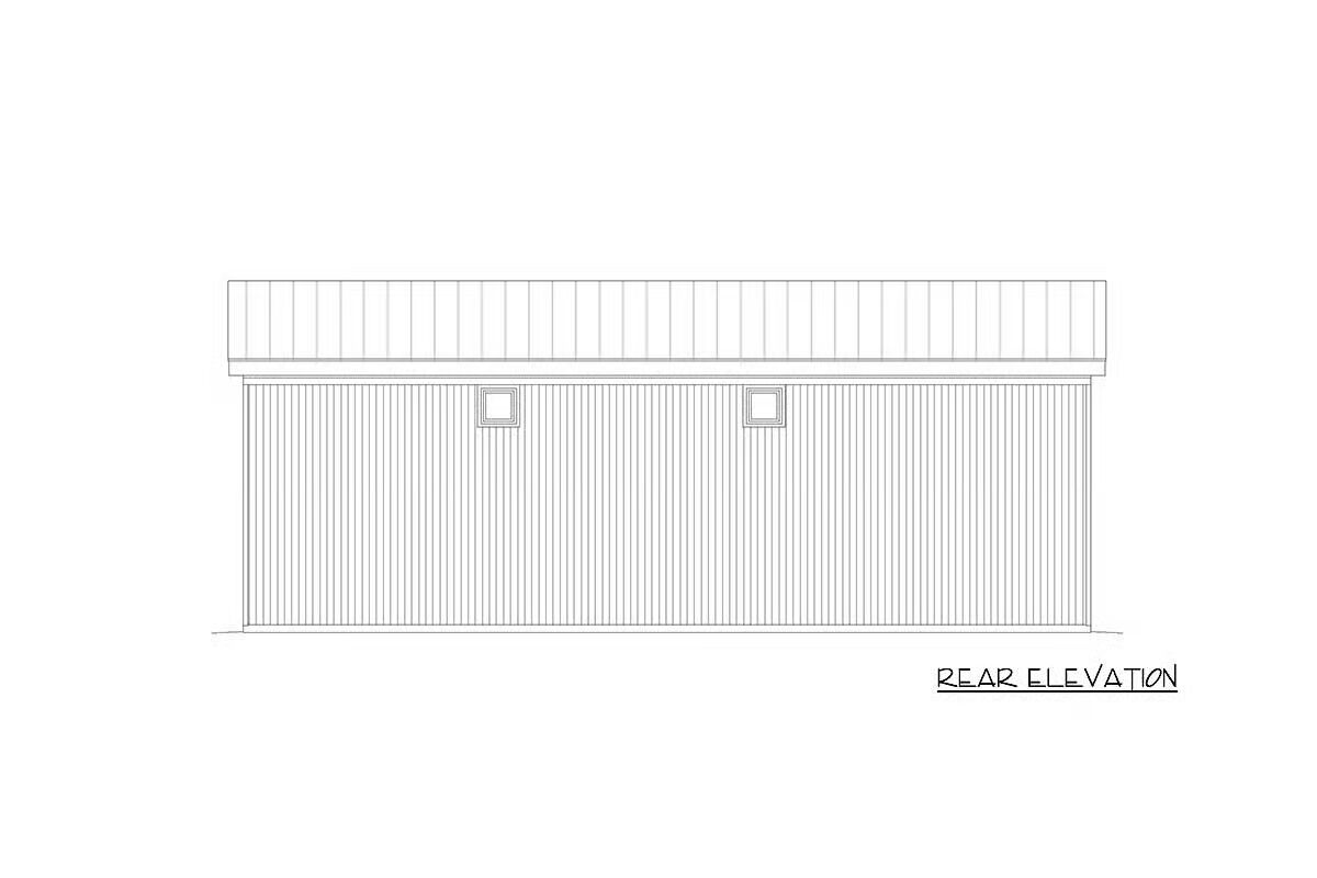 This contemporary barndominium-style home plan combines modern design with practical functionality, offering a spacious workshop and parking for up to four vehicles on the main level, with comfortable living quarters above.