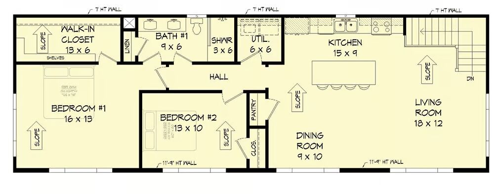 The right side features a seamless flow between the kitchen, dining, and living areas, highlighted by a large island ideal for casual meals and entertaining. On the left, two bedrooms share a full bath, with Bedroom 1 boasting a spacious walk-in closet.