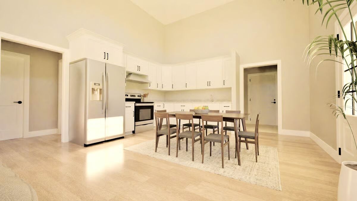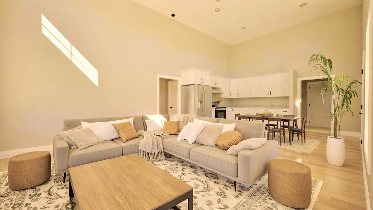 The open-concept layout serves as the heart of the home, showcasing soaring 14-foot ceilings that create an airy, light-filled atmosphere. The living room, dining area, and kitchen flow seamlessly together—perfect for relaxed daily living or entertaining with ease.