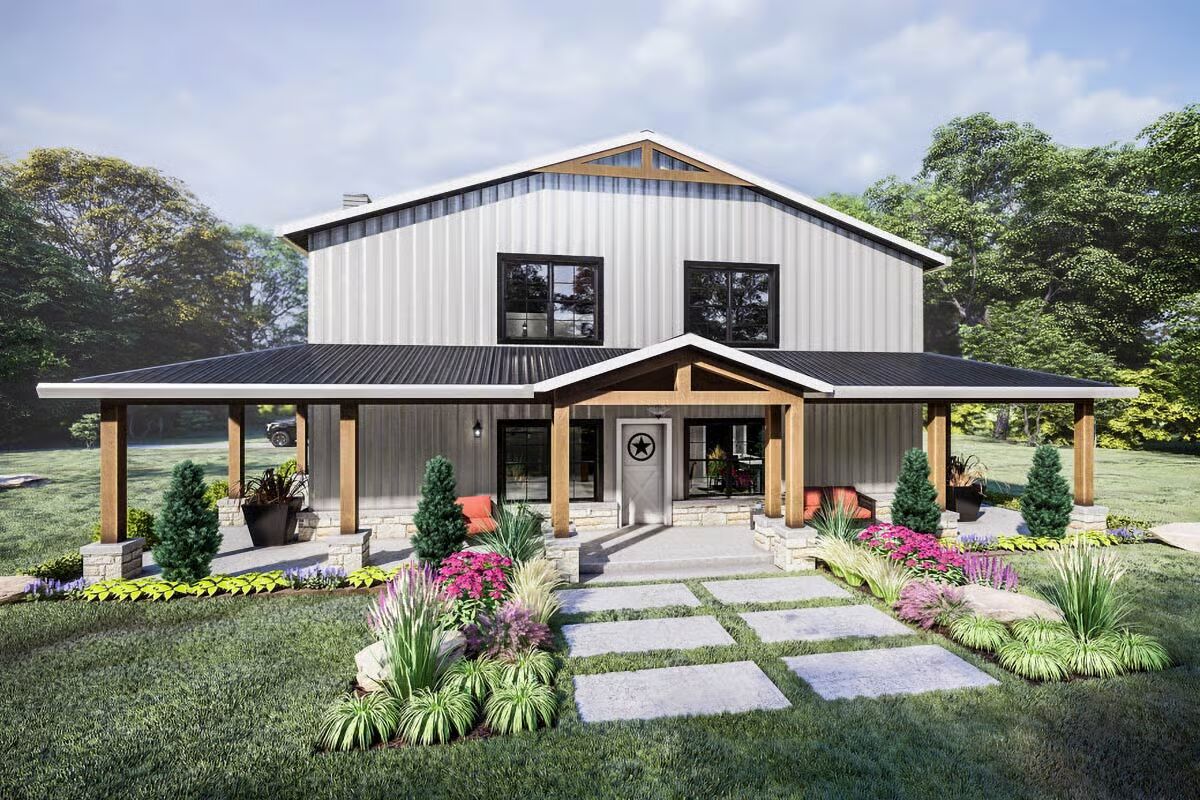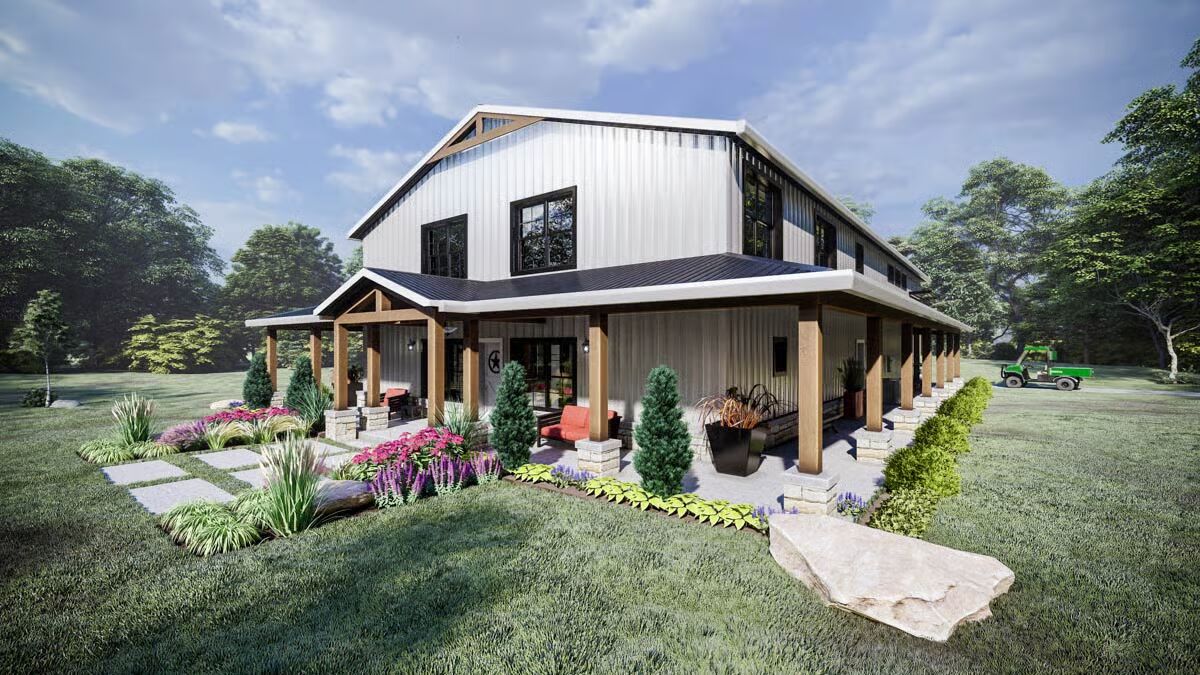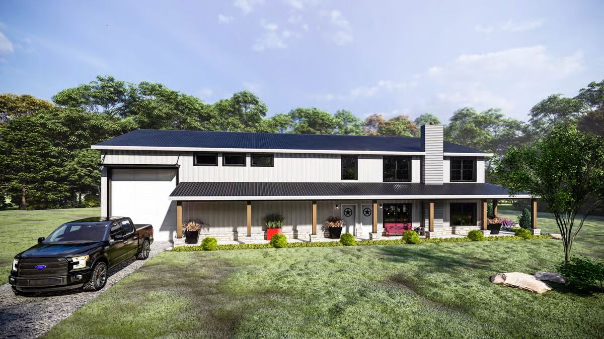 This striking 2,724 sq. ft. Barndominium-style home combines modern sophistication with functional design, featuring 2 bedrooms, 3 full baths, and an expansive 1,736 sq. ft. attached 2-car garage with shop space — all wrapped in a sleek metal exterior that exudes contemporary charm.
