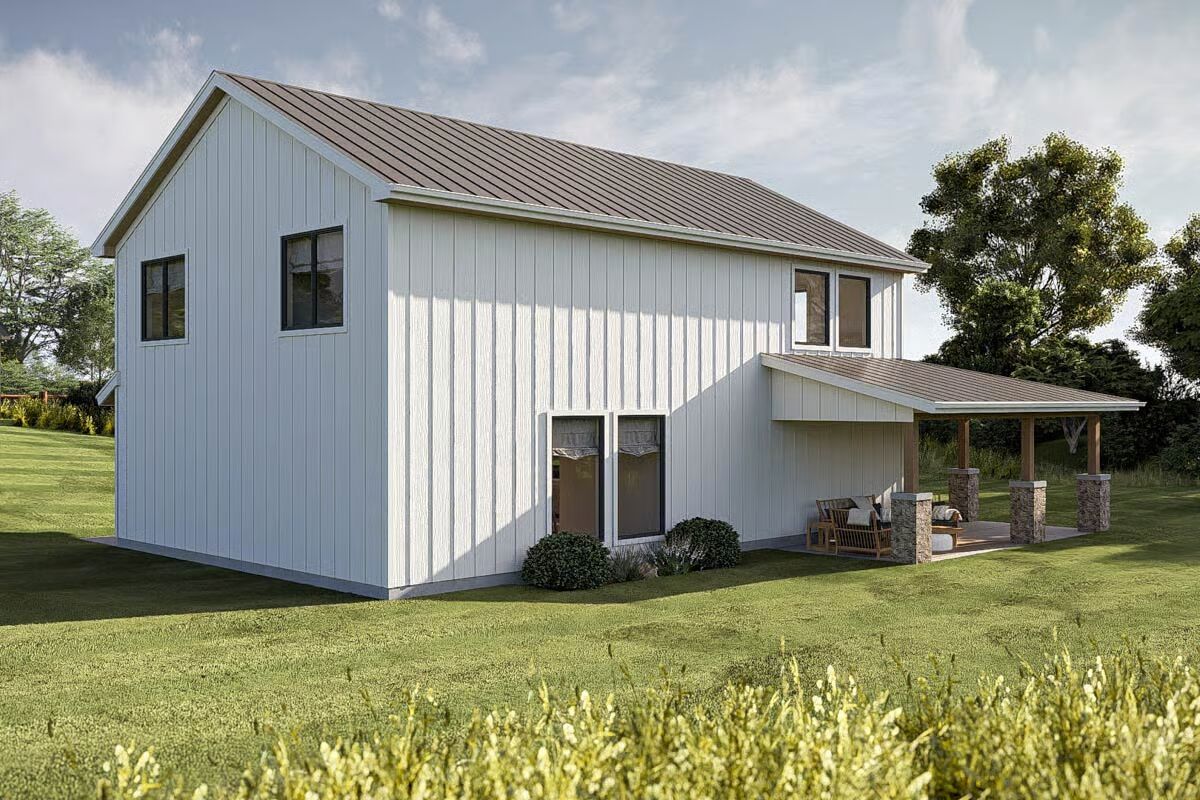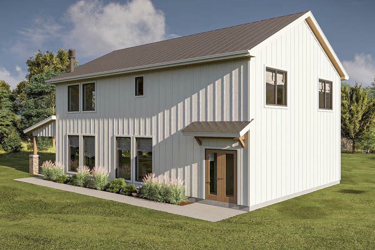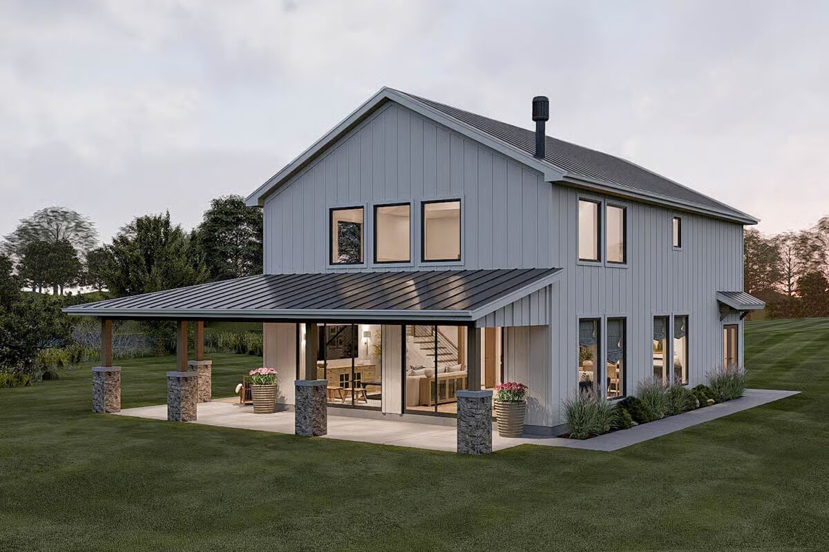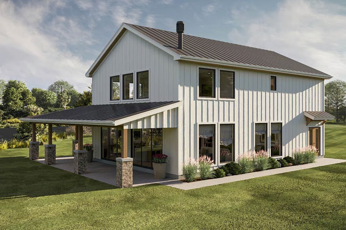 Buy This PlanThis beautiful Barndominium presents a classic farmhouse look with a prominent metal roof and ample light-filled windows.This striking Barndominium features vertical white siding and a dramatic dark metal roof, complete with a cozy covered patio.The modern Barndominium highlights a spacious outdoor living area with a covered porch and rustic stone columns, perfect for entertaining.The side view of the Barndominium showcases its clean lines, tall windows, and a practical secondary entrance with a small overhang.A quiet side porch offers a protected retreat on the Barndominium, emphasizing its blend of utility and outdoor comfort.The covered patio of the Barndominium features stunning glass sliding doors that seamlessly connect the indoor and outdoor living spaces.The bright, airy dining space features a large rustic wood table, modern lighting, and expansive windows overlooking the yard.A soaring two-story living room boasts board-and-batten walls and a modern open staircase, creating a grand yet comfortable feel.This inviting living area is anchored by a sleek, freestanding wood-burning fireplace and provides easy access to the patio through sliding doors.The open-concept lower level showcases a striking open-riser staircase with horizontal railing, connecting the living and dining areas.A stylish kitchen island with a dark, richly veined countertop offers ample counter space and casual seating for four.The kitchen’s sleek wood cabinetry and dark countertops contrast beautifully with the light wood flooring and bright dining area.A bright loft area, complete with a vaulted ceiling and two cozy chairs, serves as a peaceful reading or relaxation nook.This tranquil bedroom features a wooden dresser, a large window with a view, and an earthy color palette for a relaxing retreat.The primary bedroom includes a warm wood bed frame against shiplap-style walls and an entryway leading to the ensuite bathroom.The bathroom vanity features twin vessel sinks, black fixtures, and decorative mirrors, giving it a modern farmhouse touch.