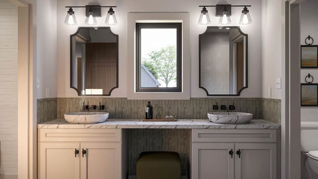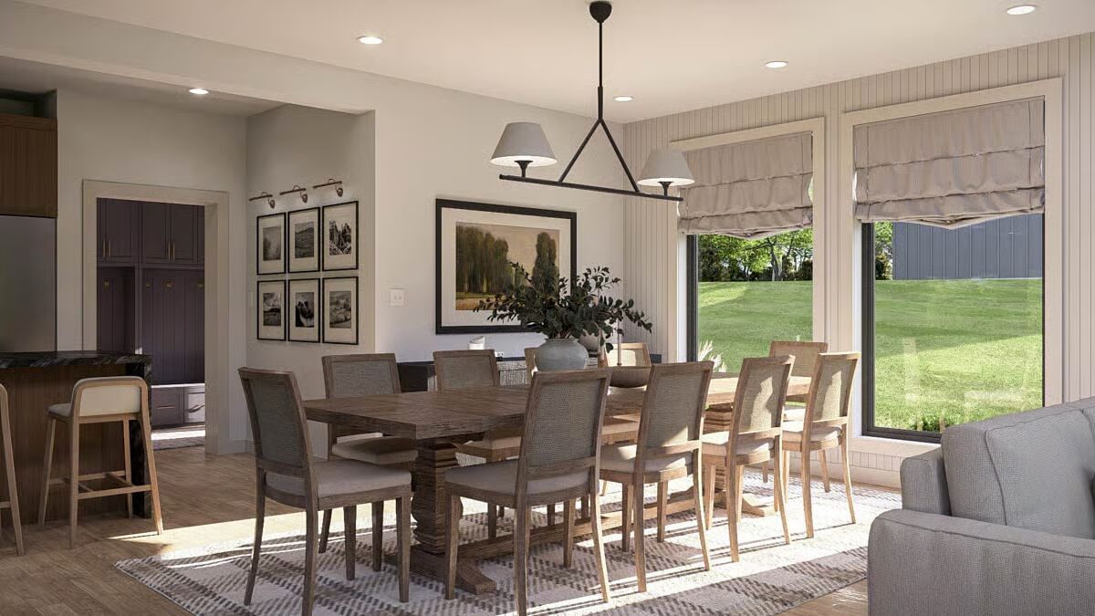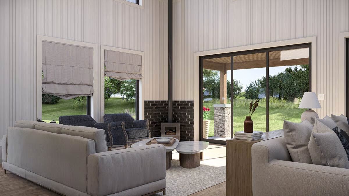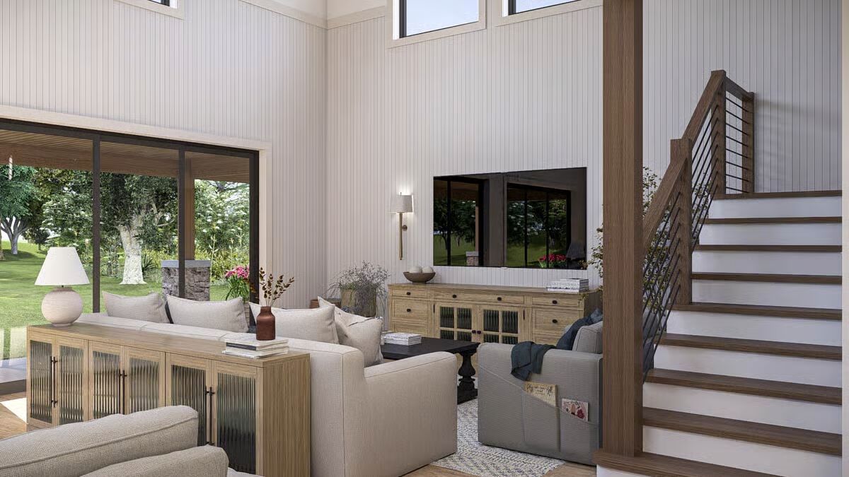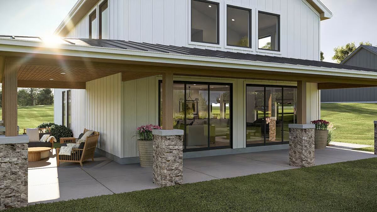 Buy This PlanThis beautiful Barndominium presents a classic farmhouse look with a prominent metal roof and ample light-filled windows.This striking Barndominium features vertical white siding and a dramatic dark metal roof, complete with a cozy covered patio.The modern Barndominium highlights a spacious outdoor living area with a covered porch and rustic stone columns, perfect for entertaining.The side view of the Barndominium showcases its clean lines, tall windows, and a practical secondary entrance with a small overhang.A quiet side porch offers a protected retreat on the Barndominium, emphasizing its blend of utility and outdoor comfort.The covered patio of the Barndominium features stunning glass sliding doors that seamlessly connect the indoor and outdoor living spaces.The bright, airy dining space features a large rustic wood table, modern lighting, and expansive windows overlooking the yard.A soaring two-story living room boasts board-and-batten walls and a modern open staircase, creating a grand yet comfortable feel.This inviting living area is anchored by a sleek, freestanding wood-burning fireplace and provides easy access to the patio through sliding doors.The open-concept lower level showcases a striking open-riser staircase with horizontal railing, connecting the living and dining areas.A stylish kitchen island with a dark, richly veined countertop offers ample counter space and casual seating for four.The kitchen’s sleek wood cabinetry and dark countertops contrast beautifully with the light wood flooring and bright dining area.A bright loft area, complete with a vaulted ceiling and two cozy chairs, serves as a peaceful reading or relaxation nook.This tranquil bedroom features a wooden dresser, a large window with a view, and an earthy color palette for a relaxing retreat.The primary bedroom includes a warm wood bed frame against shiplap-style walls and an entryway leading to the ensuite bathroom.The bathroom vanity features twin vessel sinks, black fixtures, and decorative mirrors, giving it a modern farmhouse touch.