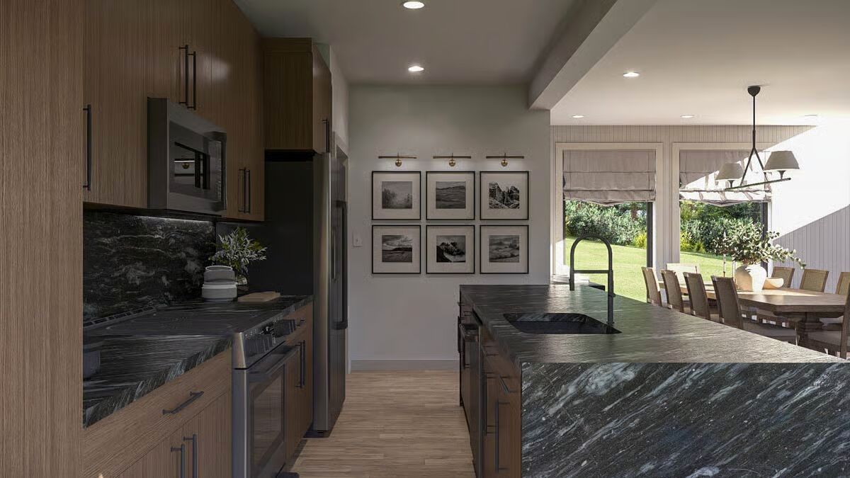 The space flows seamlessly into the dining area and well-appointed kitchen, complete with a butler’s walk-in pantry that blends convenience with style.
