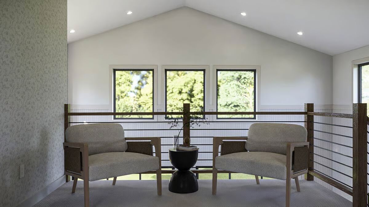 A loft overlooking the great room provides a flexible area — ideal for a home office, library, or cozy reading nook.