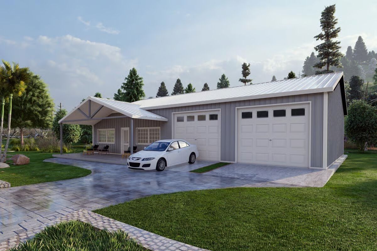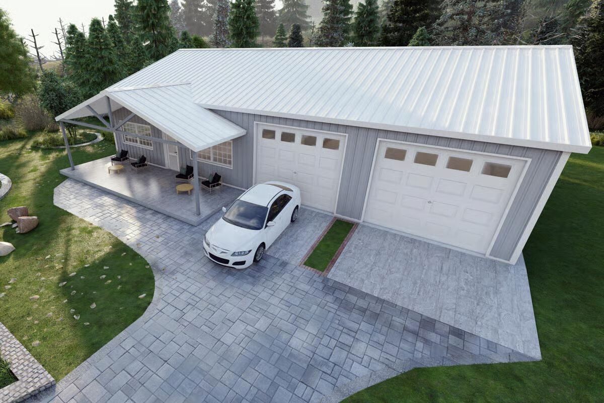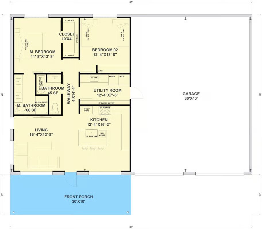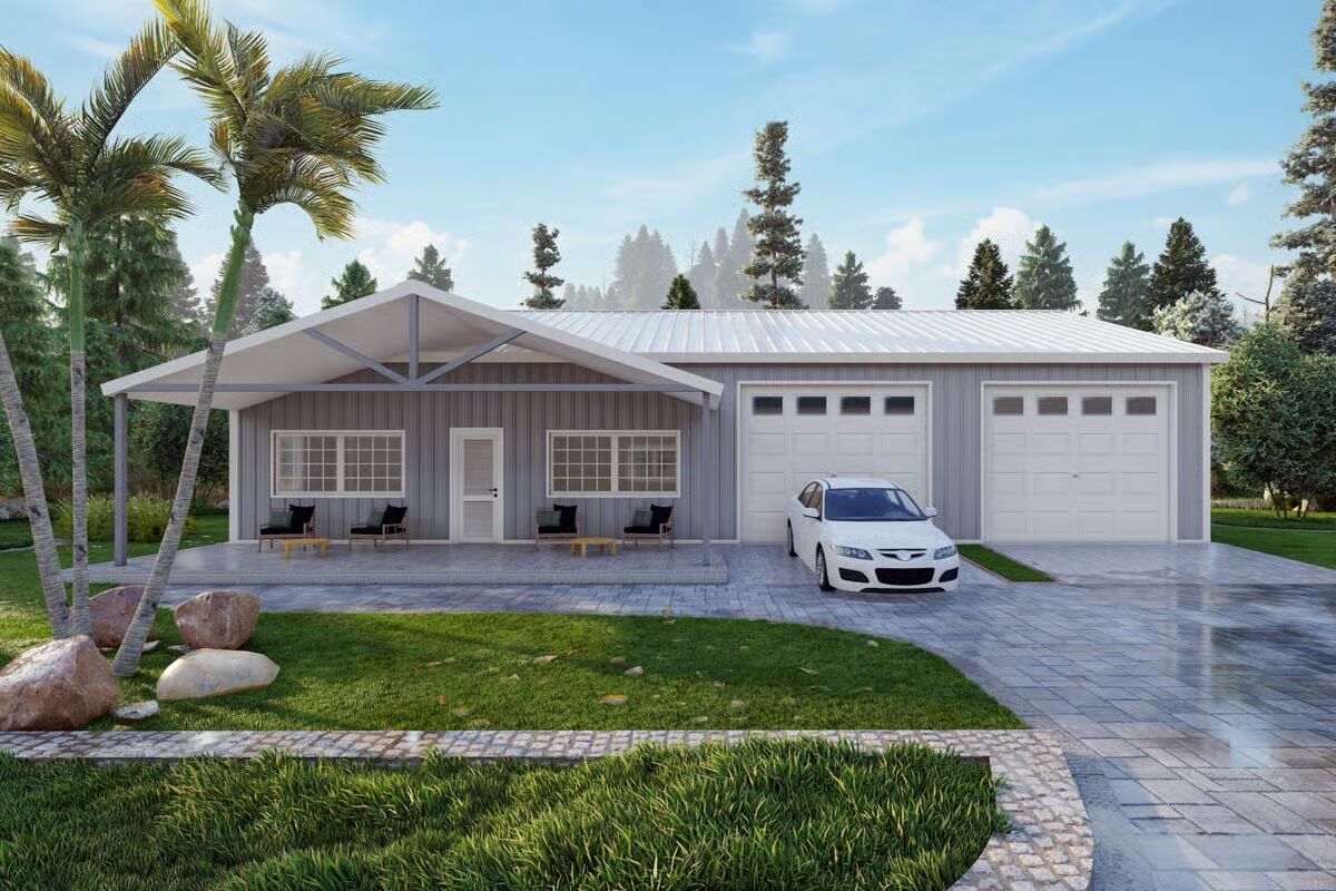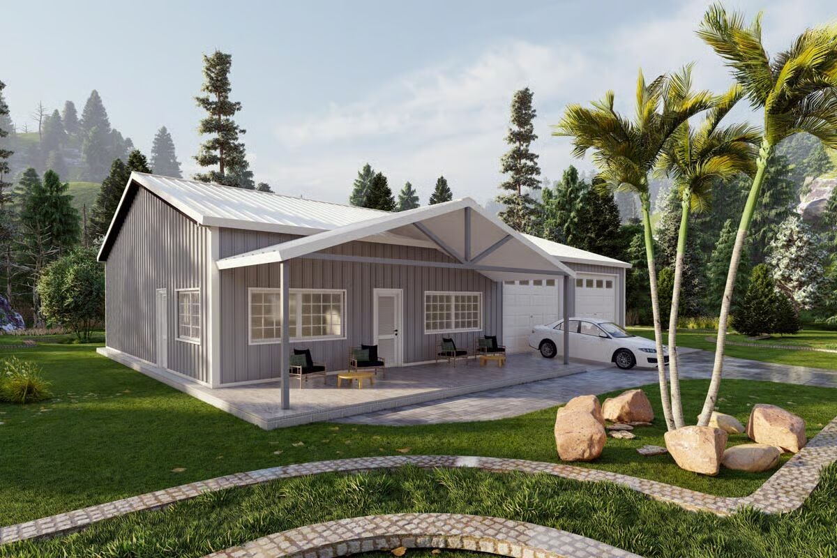 Welcome to the gallery of photos for the Modern Rustic Barndominium Ranch Home with 2-Car Garage – 1200 Sq Ft. The floor plan is shown below: