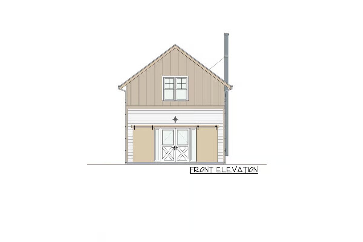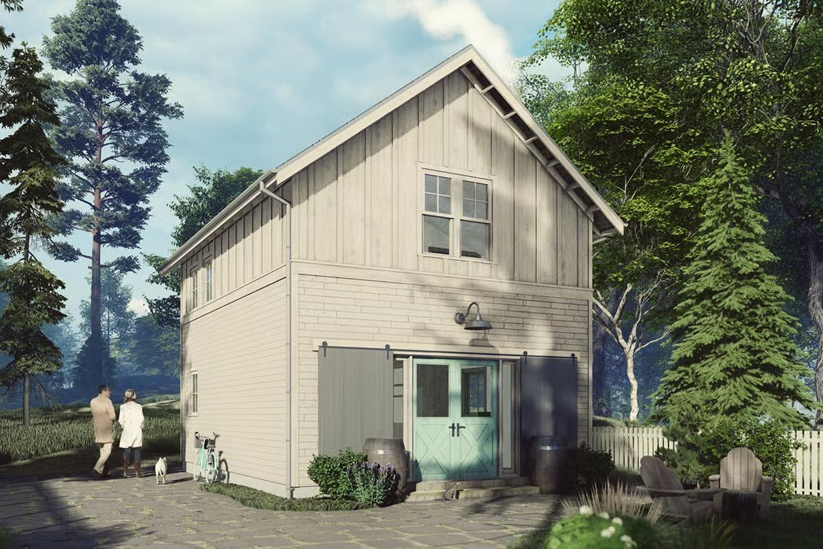 Blending charm and function, this 1,000 sq. ft. home features a retro-barn inspired design with a mix of brick and board-and-batten siding and distinctive sliding barn doors at the front.