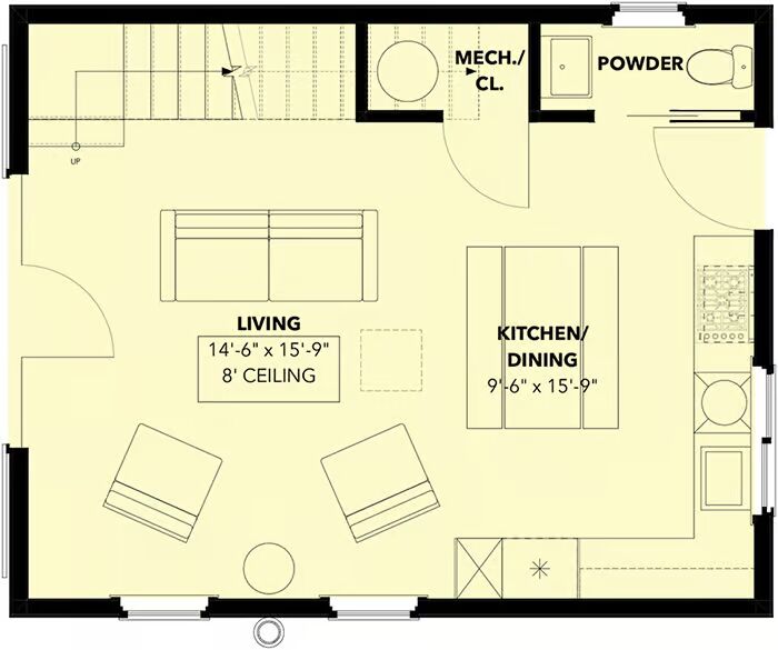 The main level offers a completely open layout, seamlessly combining the living room, kitchen, and dining area into one versatile space. A kitchen window over the sink brings in natural light, while a powder room tucked in the back corner adds convenience.