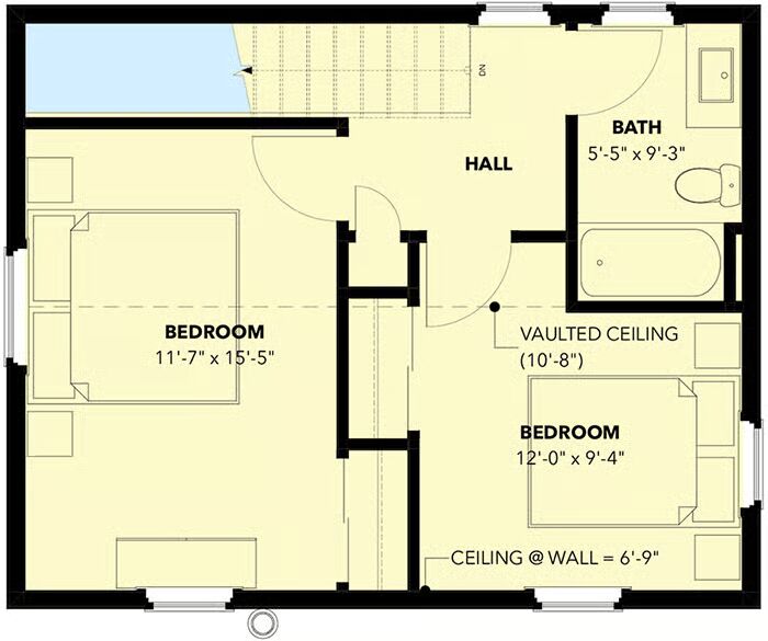 Upstairs, you’ll find two bedrooms with vaulted ceilings and a full bath, creating a comfortable and efficient living arrangement.