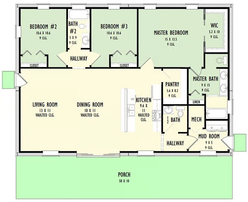 A 50-foot-wide front porch, 10 feet deep, creates a welcoming first impression and provides ample outdoor living space.