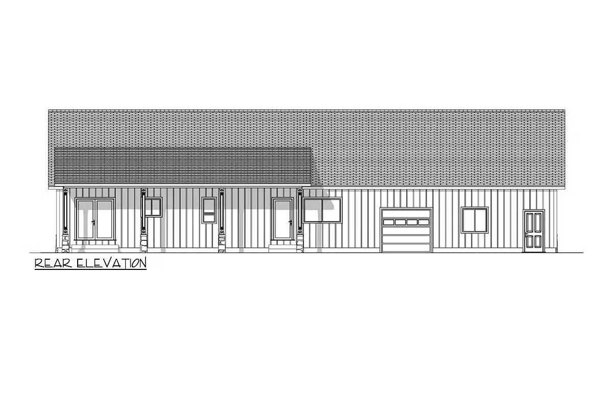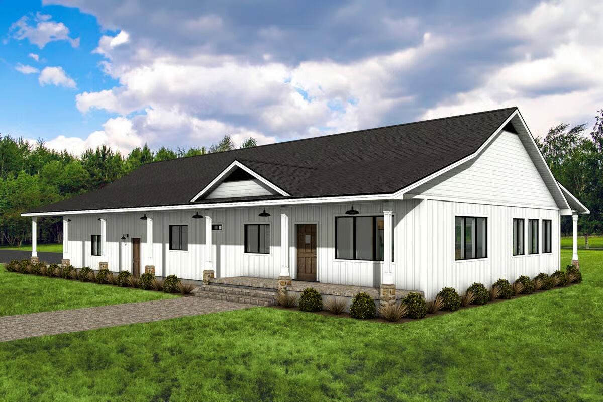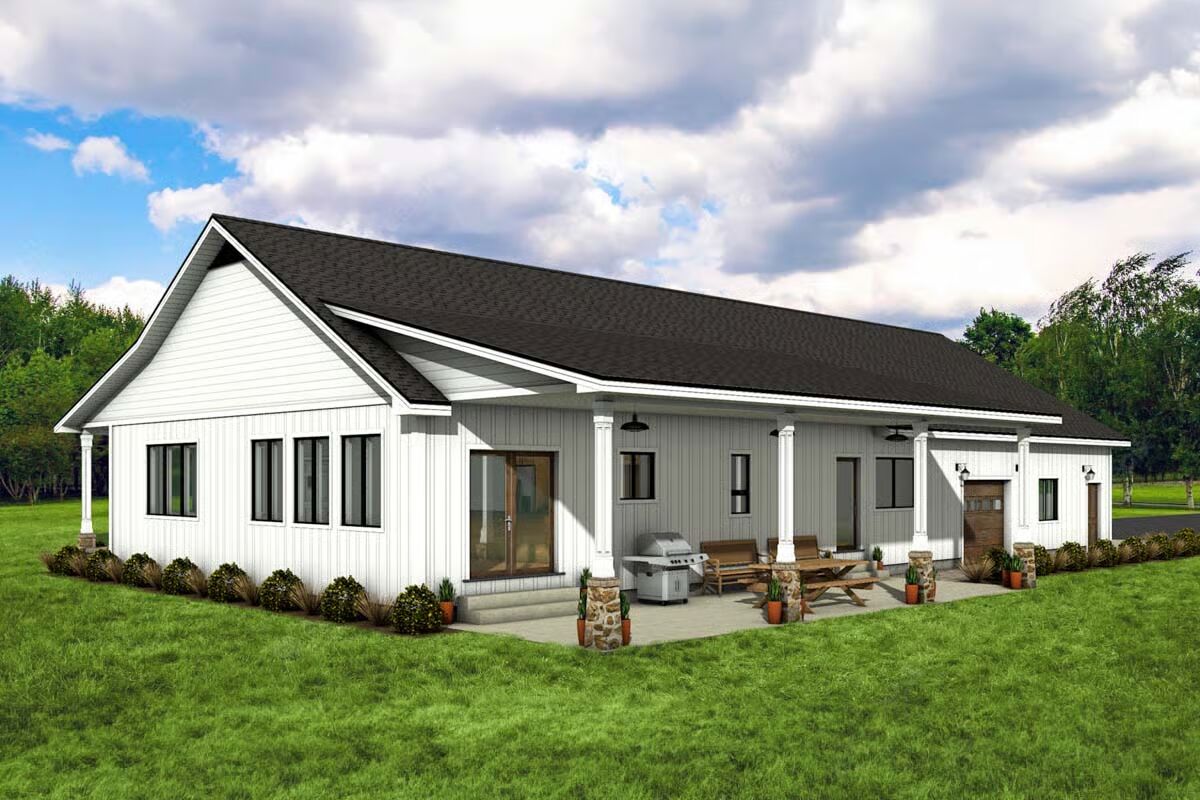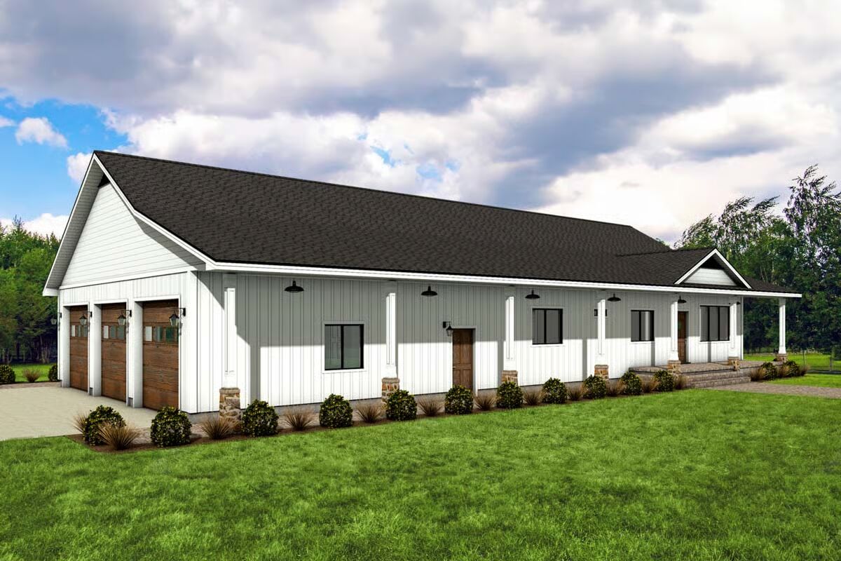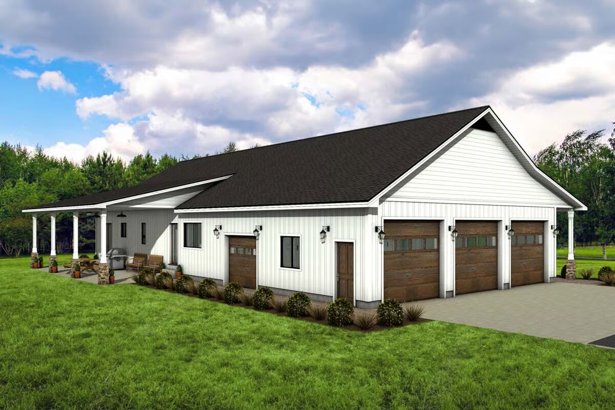 This modern barndominium shows off a sleek white exterior with dark trim and charming stone column bases, blending rustic character with a contemporary feel.An impressive three-car garage and a wide covered porch create a grand yet welcoming entrance to this beautiful barndominium.The rear of this striking barndominium features a three-car garage with rich wooden doors that add a touch of warmth and style to the design.The back of this home highlights an inviting outdoor patio space, perfect for entertaining and enjoying the outdoors right off the main living area.