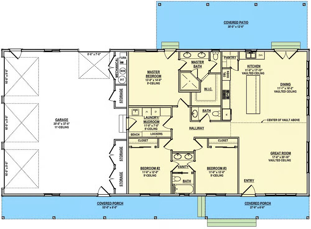 This barndominium-style home offers 1,980 sq. ft. of heated living space with 3 bedrooms and 2.5 bathrooms, crafted with conventional wood framing and 2×6 exterior walls for strength and efficiency.