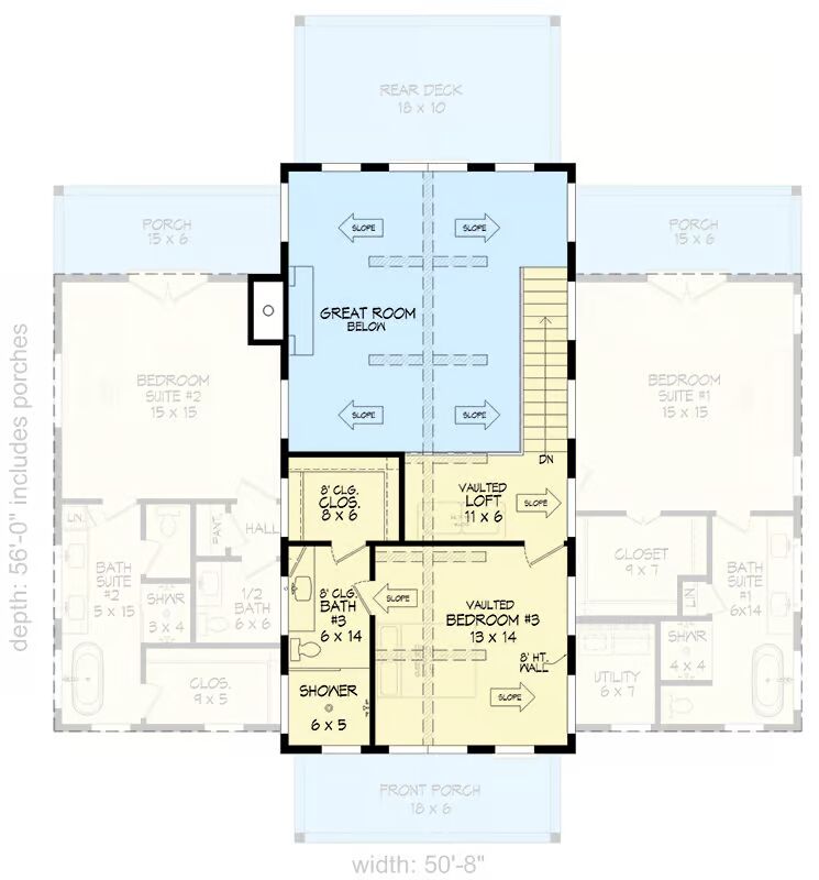 Both main-level bedrooms open to their own private covered porches (15′ x 6′), and the great room extends to a spacious 18′ x 10′ rear porch, perfect for outdoor relaxation.