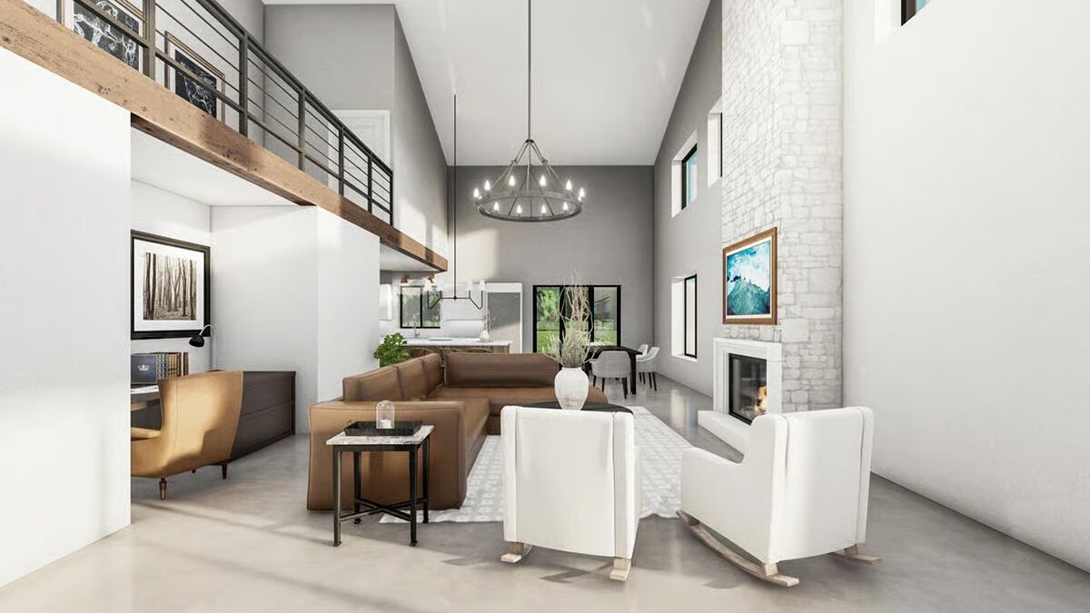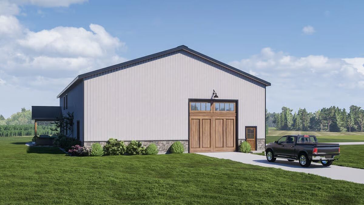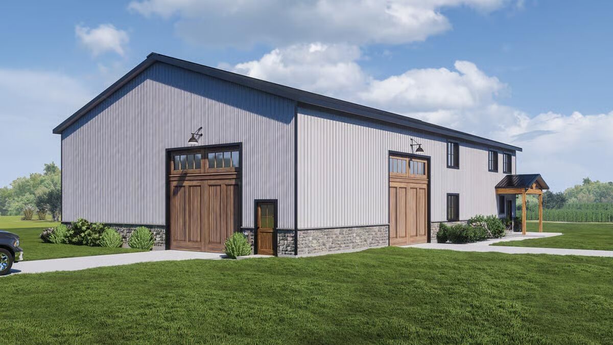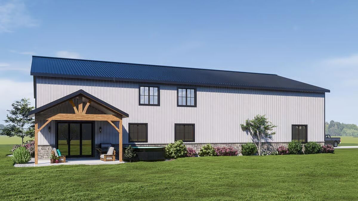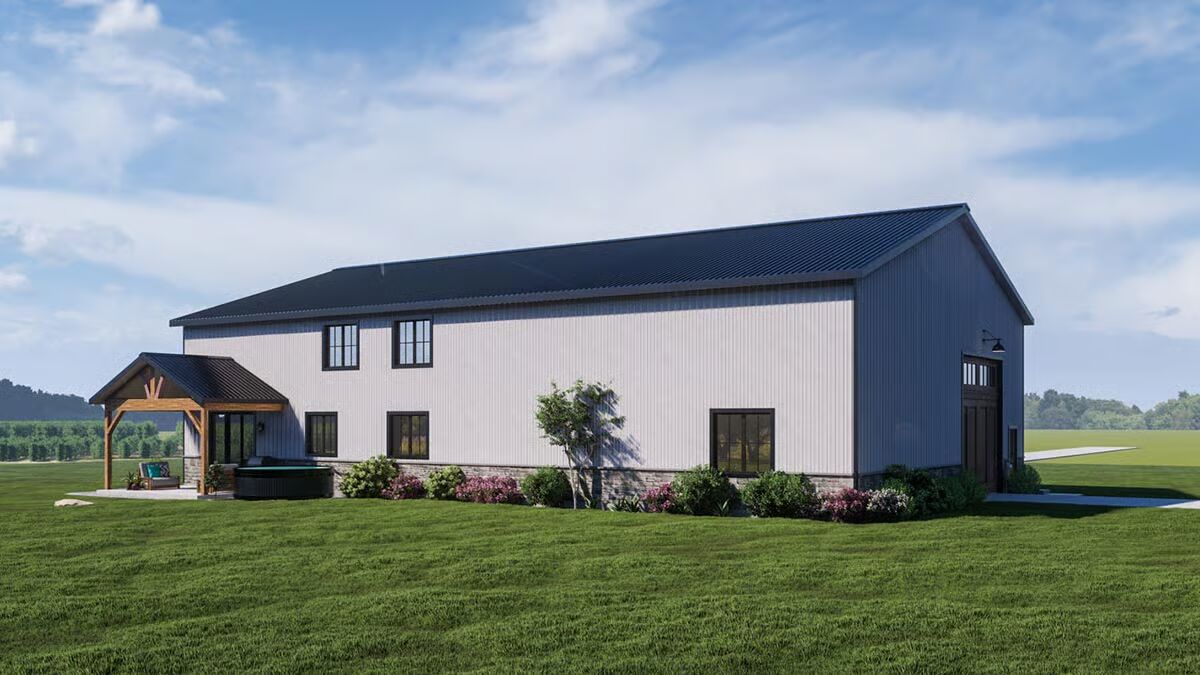 This striking barndominium combines rustic charm and modern living with an expansive metal exterior and a welcoming timber-framed porch.A relaxing backyard retreat with a covered porch and hot tub offers the perfect balance to the home’s sturdy industrial design.The side profile showcases a long, sleek metal roof and a cozy patio with a hot tub, making indoor-outdoor living effortless.Long and functional, this view highlights the beautiful contrast of the light siding, dark windows, and natural stone wainscot.The front elevation makes a grand statement with a massive, wood-paneled garage door beneath the sharp lines of the metal cladding.Blending utility and curb appeal, this angle features both a prominent garage entry and a sheltered front door for guests.Industrial style meets country elegance with two impressive wooden garage doors flanked by a stylish stone foundation.A symmetrical front view centers on the stunning, oversized garage door, ready to welcome vehicles and hobbies alike.The sweeping country setting perfectly frames the home’s profile, highlighting the practical yet stylish design.Large black windows punctuate the bright siding, drawing the eye to the cozy porches and the lush surrounding landscape.The soaring two-story great room features an open-concept layout, a towering stone fireplace, and a sleek metal staircase leading to the loft.The chef-ready kitchen impresses with a bright white aesthetic, a wooden-base island for seating, and a dramatic high ceiling.This bright and contemporary kitchen features a spacious white countertop, sleek cabinetry, and rustic wood accents that tie into the home’s theme.Sunlight pours into the vast main living area, where a contemporary loft railing and rustic wood beam add a modern farmhouse touch.An impressive living space boasts an abundance of natural light, a dramatic fireplace, and a comfortable setup for relaxation and entertaining.The stylish wooden treads and industrial metal railing of the staircase serve as a striking focal point in the airy, open floor plan.The master bedroom offers a chic retreat with a striking dark accent wall, vaulted ceiling, and ample window space.