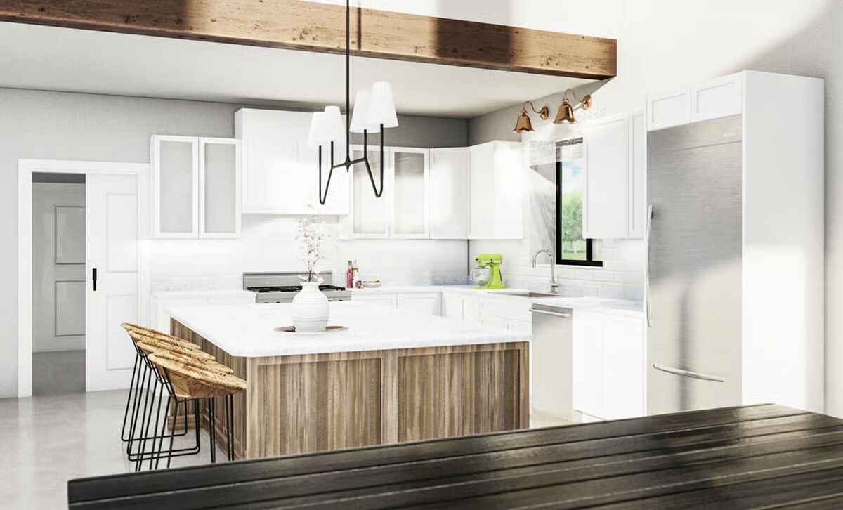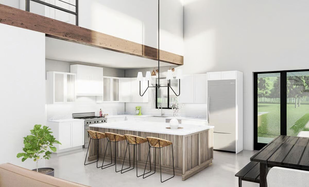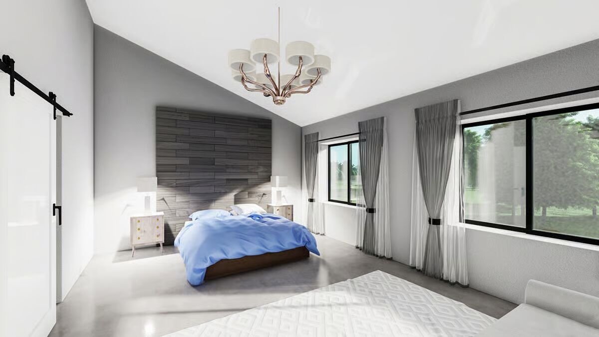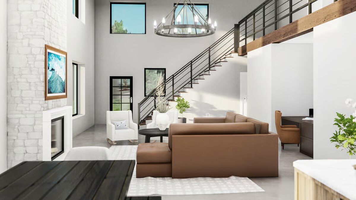 This striking barndominium combines rustic charm and modern living with an expansive metal exterior and a welcoming timber-framed porch.A relaxing backyard retreat with a covered porch and hot tub offers the perfect balance to the home’s sturdy industrial design.The side profile showcases a long, sleek metal roof and a cozy patio with a hot tub, making indoor-outdoor living effortless.Long and functional, this view highlights the beautiful contrast of the light siding, dark windows, and natural stone wainscot.The front elevation makes a grand statement with a massive, wood-paneled garage door beneath the sharp lines of the metal cladding.Blending utility and curb appeal, this angle features both a prominent garage entry and a sheltered front door for guests.Industrial style meets country elegance with two impressive wooden garage doors flanked by a stylish stone foundation.A symmetrical front view centers on the stunning, oversized garage door, ready to welcome vehicles and hobbies alike.The sweeping country setting perfectly frames the home’s profile, highlighting the practical yet stylish design.Large black windows punctuate the bright siding, drawing the eye to the cozy porches and the lush surrounding landscape.The soaring two-story great room features an open-concept layout, a towering stone fireplace, and a sleek metal staircase leading to the loft.The chef-ready kitchen impresses with a bright white aesthetic, a wooden-base island for seating, and a dramatic high ceiling.This bright and contemporary kitchen features a spacious white countertop, sleek cabinetry, and rustic wood accents that tie into the home’s theme.Sunlight pours into the vast main living area, where a contemporary loft railing and rustic wood beam add a modern farmhouse touch.An impressive living space boasts an abundance of natural light, a dramatic fireplace, and a comfortable setup for relaxation and entertaining.The stylish wooden treads and industrial metal railing of the staircase serve as a striking focal point in the airy, open floor plan.The master bedroom offers a chic retreat with a striking dark accent wall, vaulted ceiling, and ample window space.