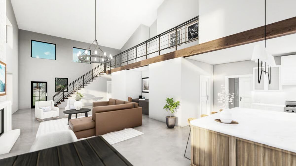 The interior is anchored by a two-story great room that seamlessly flows into the dining area and kitchen, creating the perfect setting for entertaining. A railed staircase leads to a spacious loft overlooking the great room below.