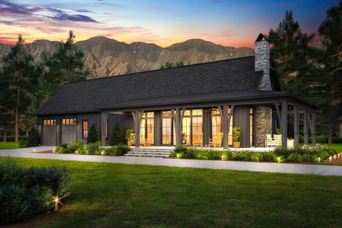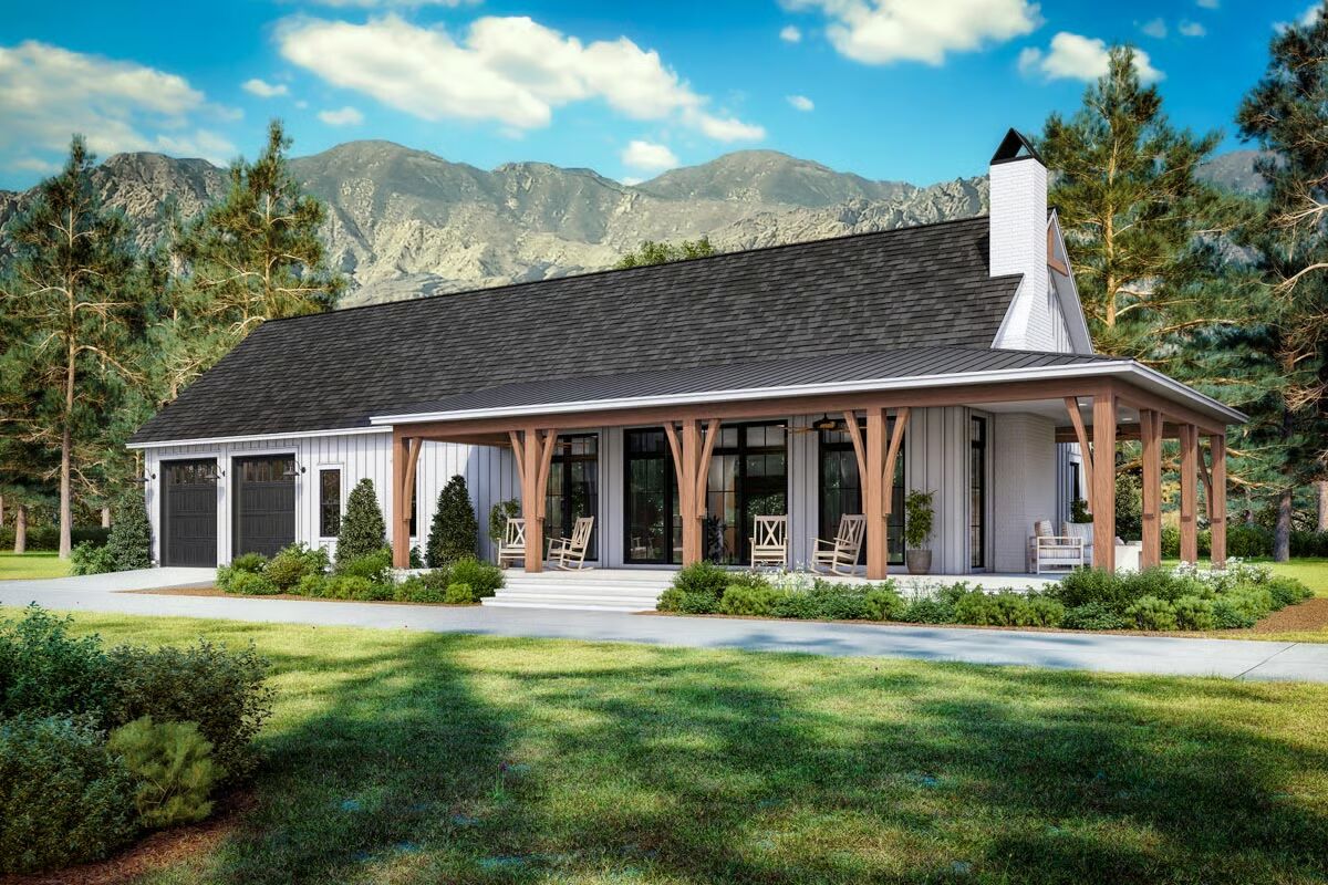 Designed with conventional wood framing and 2×6 exterior walls, it showcases today’s most popular features, including a vaulted open-concept living area, spacious kitchen with walk-in pantry, a split-bedroom layout, and an inviting wraparound porch.