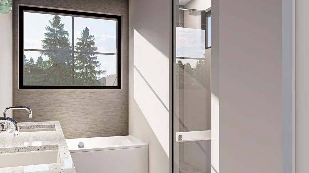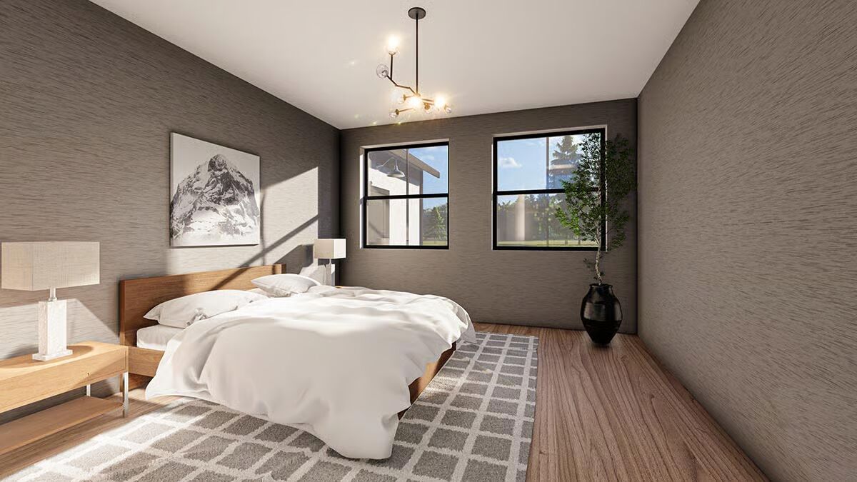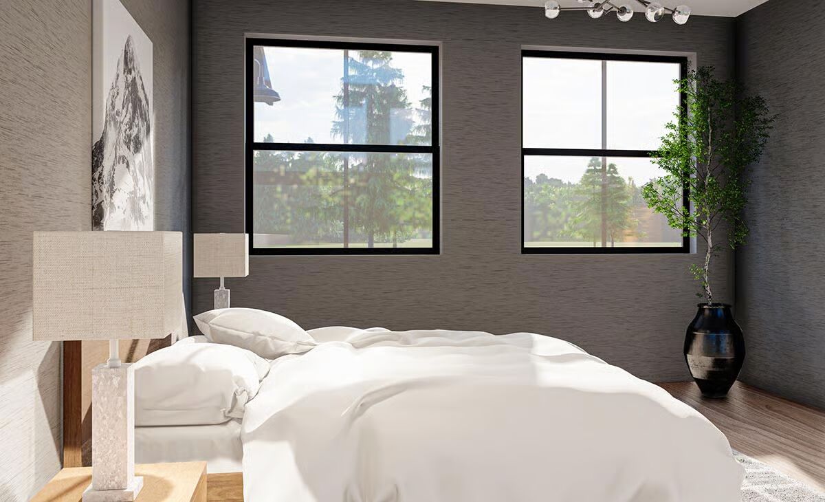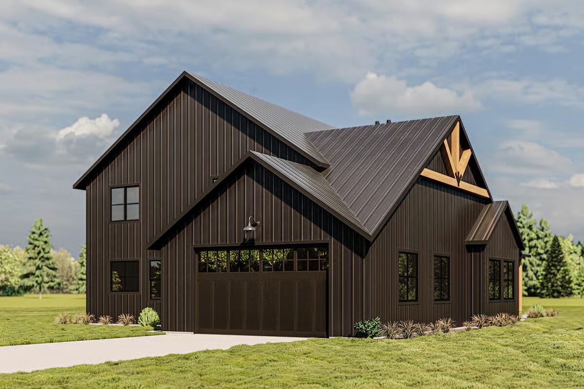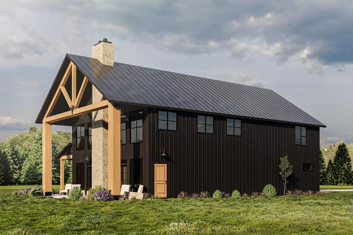 This Barndominium combines rustic timber with modern dark metal to create a sophisticated, dramatic farmhouse aesthetic.The striking dark Barndominium is framed by a welcoming covered porch with heavy timber posts and accents.This is a fantastic front view of the modern Barndominium, showcasing the contrast between the dark siding and natural wood elements.The integrated garage and dramatic dark metal siding give this Barndominium a sharp, contemporary profile.The side elevation highlights the home’s impressive scale and includes a small attached structure, possibly a garage or utility room.A massive stone chimney and bold timber trusswork anchor the outdoor living space of this elegant Barndominium.The symmetrical back facade features a central stone fireplace and soaring windows beneath an impressive timber gable.Large windows and a covered patio area make the rear of this Barndominium an ideal space for indoor-outdoor entertaining.A spectacular two-story view showcases the open-concept kitchen, modern staircase, and loft with exposed wood beams.The bright, double-height living room is dramatically accented by a stone feature wall and a contemporary iron chandelier.The well-lit kitchen features custom cabinetry, a large marble island, and a warm wood-plank ceiling section.This cozy corner shows a modern credenza and artwork in the open living space, offering a view into a hallway and the kitchen beyond.The kitchen island, perfect for gathering, is illuminated by industrial pendant lights and surrounded by clean, white shaker-style cabinets.A moody, textured gray bedroom is brightened by natural light, a modern light fixture, and a calming wood and white palette.The bedroom provides a peaceful retreat with its minimalist decor, plush white bedding, and scenic windows overlooking the trees.This sleek bathroom features a double vanity and a glass-enclosed shower/tub combo with a view of the outdoors.