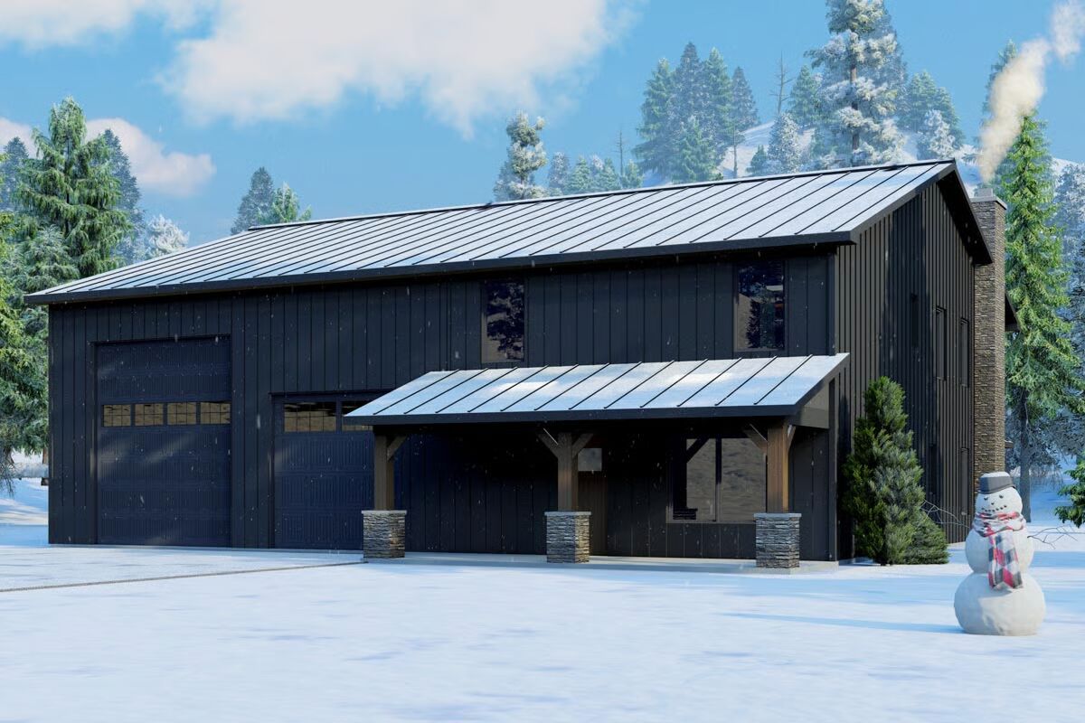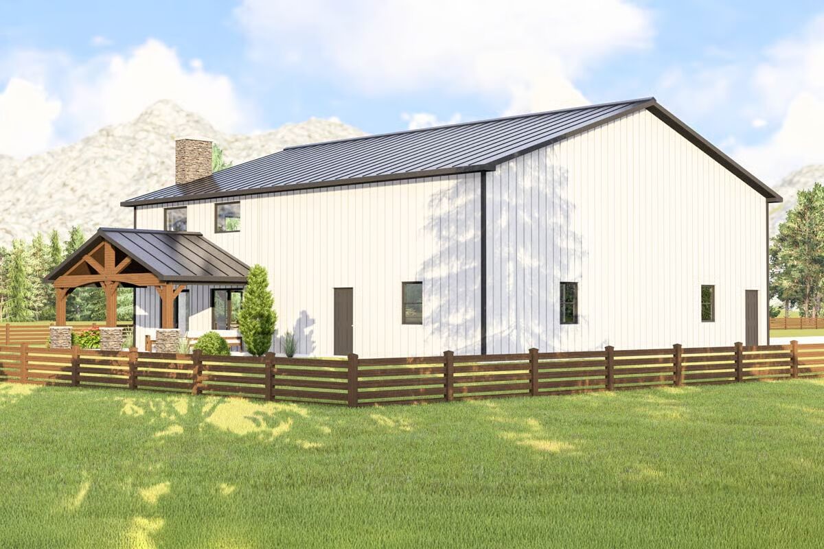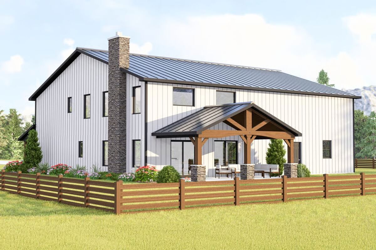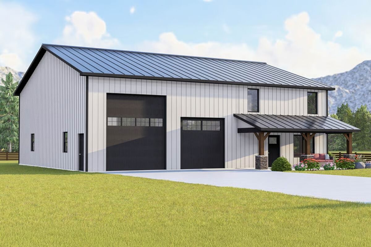 This barndominium-style home pairs modern functionality with rustic charm, featuring board and batten siding, a ribbed metal roof, and a sleek corrugated metal exterior finish.
