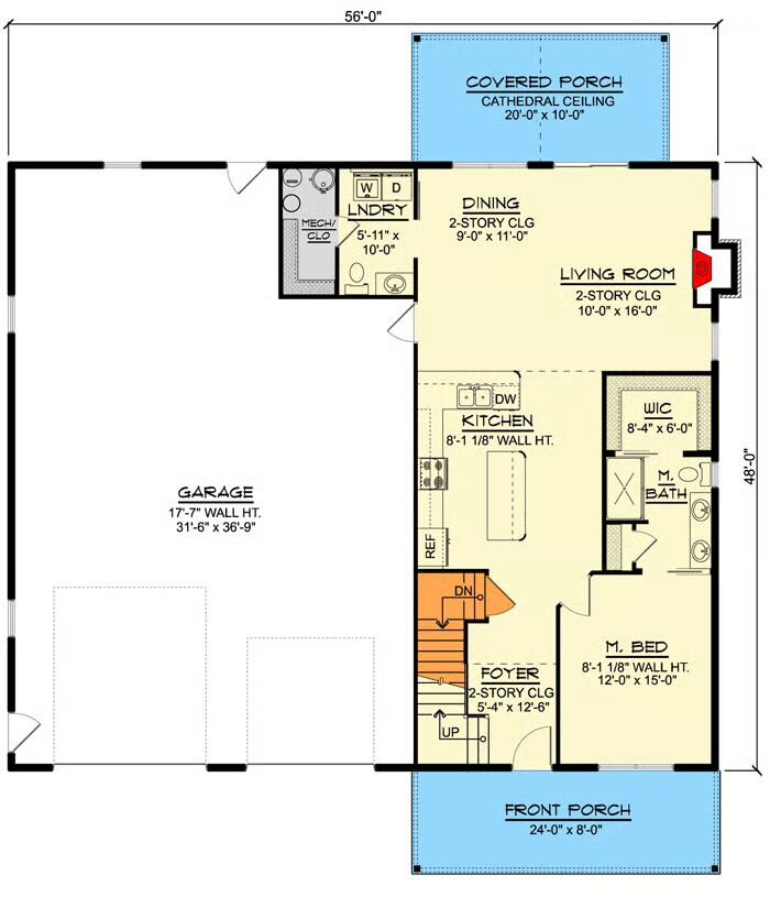 A corner fireplace anchors the soaring two-story great room, while sliding doors extend the living space to a covered porch designed for outdoor entertaining.