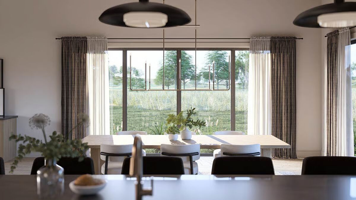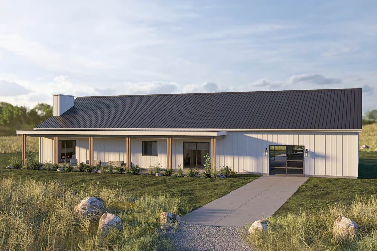 This striking modern barndominium features a low-slung profile and a welcoming covered porch, blending rural simplicity with upscale design.The sunset casts a warm glow over this sleek barndominium, highlighting the dramatic contrast of its dark roof and bright white siding.Rustic yet refined, this barndominium’s side view showcases an integrated carport and a long porch perfect for enjoying the open fields.The board-and-batten siding and twin glass garage doors give this modern barn-style home a clean, contemporary edge.A blend of natural textures and clean lines, this barndominium is a picture of country-chic living surrounded by tall grasses.The cozy living room is enhanced by vaulted ceilings, rustic wooden beams, and a sliding door that connects the indoors to the sprawling landscape.A sophisticated gas fireplace and custom built-ins anchor this bright living space, offering warmth and modern storage.This spacious kitchen features a large center island with sleek seating, making it the perfect hub for both cooking and casual dining.Enjoy the open-concept design where the gourmet kitchen, with its crisp white cabinetry, flows effortlessly into the main living areas.Natural light pours into the elegant dining area, where a stylish linear chandelier hangs over a table surrounded by sweeping views.Floor-to-ceiling windows turn this dining room into a scenic retreat, ideal for memorable meals with a peaceful, natural backdrop.Retreat to a serene bedroom sanctuary featuring a plush bed, stylish pendant lighting, and direct access to the outdoor patio.Unwind in luxury with a deep, freestanding soaking tub positioned between dual vanities and under a large window with a view.An impressive glass-enclosed office space features bold wallpaper and a minimalist desk setup, providing a quiet place to work.