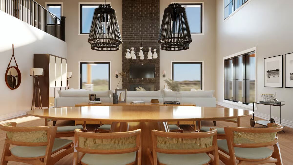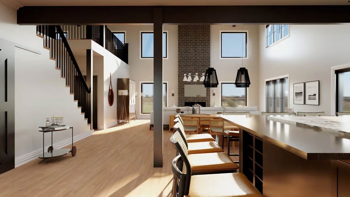 A long driveway leads to the impressive Barndominium, showcasing its dark façade and generous garage space.The striking dark Barndominium features a three-bay garage and a welcoming covered porch entry.This expansive side view highlights the black metal siding, dark roof, and a stunning stone chimney feature.Stone features anchor the rear of the Barndominium, providing multiple covered patios for outdoor living.Stone pillars and natural wood accents elevate the covered porch entrance of this modern Barndominium design.The living area is bright and airy, centered around a modern black brick fireplace and large windows with scenic views.A high-ceiling great room features a crisp white sectional and a unique, tiered modern chandelier over the seating area.Oversized woven light fixtures hang over the dining table, beautifully framing the two-story living space and brick fireplace.The open-concept main floor features a dramatic staircase and a loft balcony overlooking the bright, spacious living room.A striking modern staircase with black railings separates the bright dining area from the rest of the open living space.The sleek, dark kitchen features glass-front cabinetry, marble backsplash, and a large island with woven bar seating.A view from the kitchen shows the dramatic scale of the open-concept design, featuring high ceilings and exposed beam accents.Luxuriously textured stone walls surround the deep-soaking tub and dark wood vanity in this spa-like bathroom.This bedroom features a sophisticated dark accent wall contrasted with a stylish cane and leather headboard.The main bathroom showcases warm, full-height stone-look tile and extensive dark wood vanities with marble countertops.Bright light streams into the primary bedroom through floor-to-ceiling glass doors leading to an outdoor area.A minimalist bedroom design features a contrasting black and white wall, a neutral upholstered bed, and modern hanging pendants.This cozy sitting room features a rich tan leather sofa, rustic wood beams, and a large abstract landscape art piece.