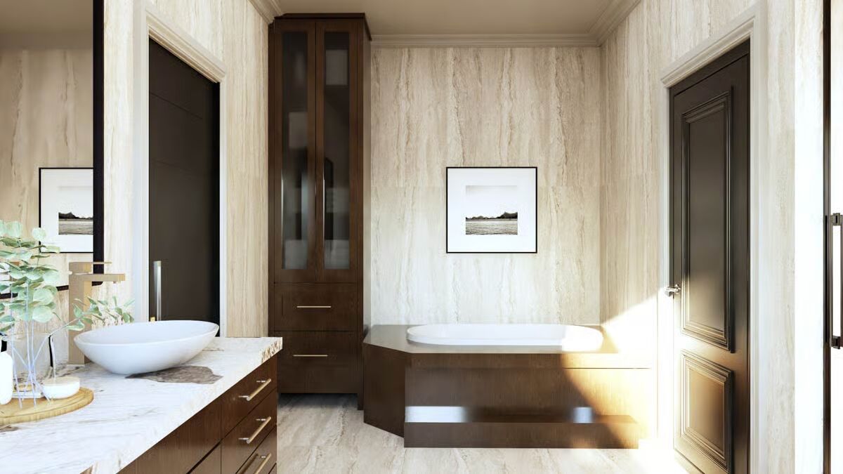 The luxurious main-floor master suite offers a private retreat, complete with a spa-like en-suite bath, a spacious walk-in closet, and direct access to the laundry room.