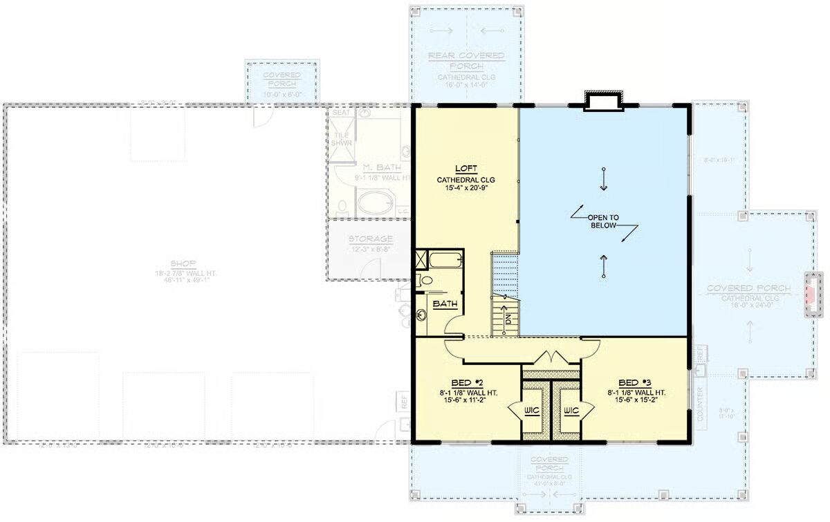 A standout element of this plan is the massive 2,120 sq. ft. integrated workshop—ideal for hobbyists, entrepreneurs, or anyone needing abundant storage—conveniently accessible from inside the home.