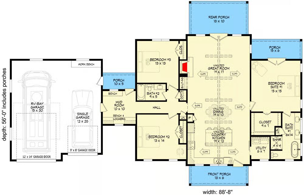The vaulted great room extends seamlessly to an 18′ by 10′ covered rear porch, providing an ideal space for outdoor living and entertaining.