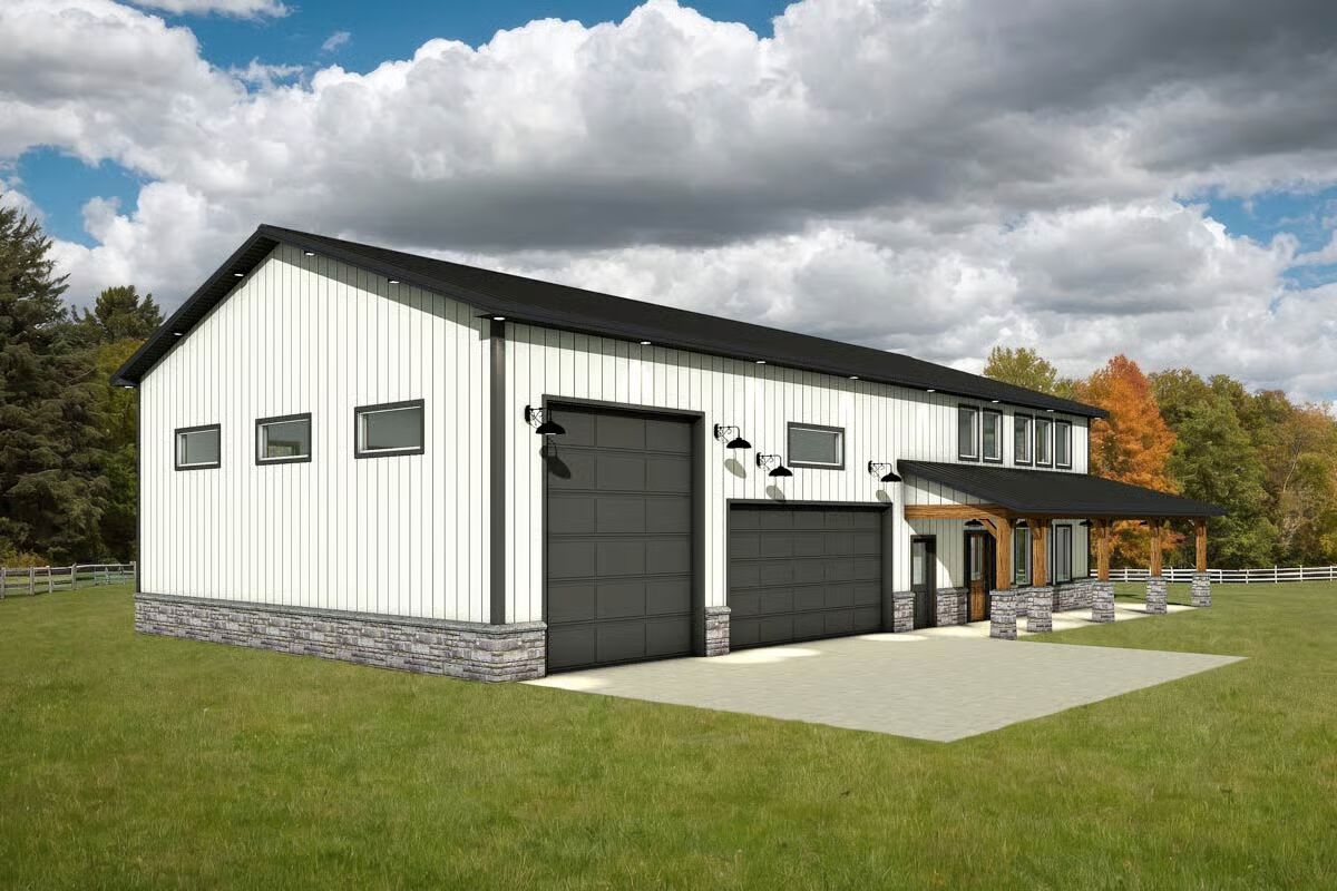 This thoughtfully designed Barndominium house plan delivers 2,124 sq. ft. of heated living space, featuring 3 bedrooms and 2.5 bathrooms.