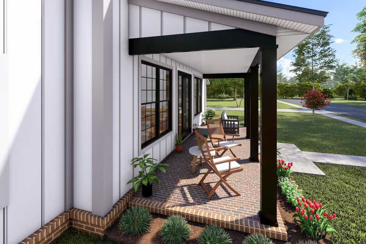 This 3-bedroom, 2-bath farmhouse blends rustic barndominium charm with modern functionality, offering 1,656 sq. ft. of heated living space plus a 682 sq. ft. 3-car garage. A welcoming 8′-deep covered front porch sets the tone for relaxed country living.