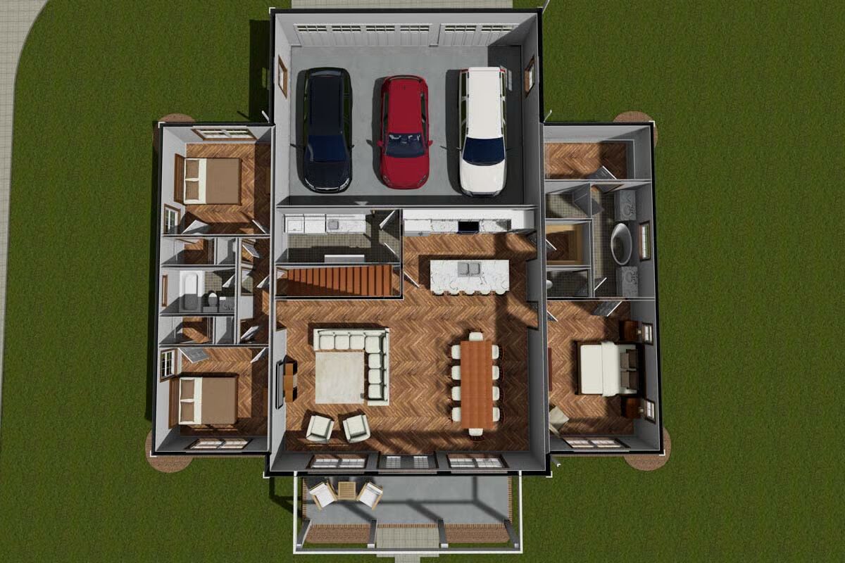 The thoughtful split-bedroom layout places two secondary bedrooms and a shared full bath on one side of the home, while the luxurious master suite enjoys privacy on the other.