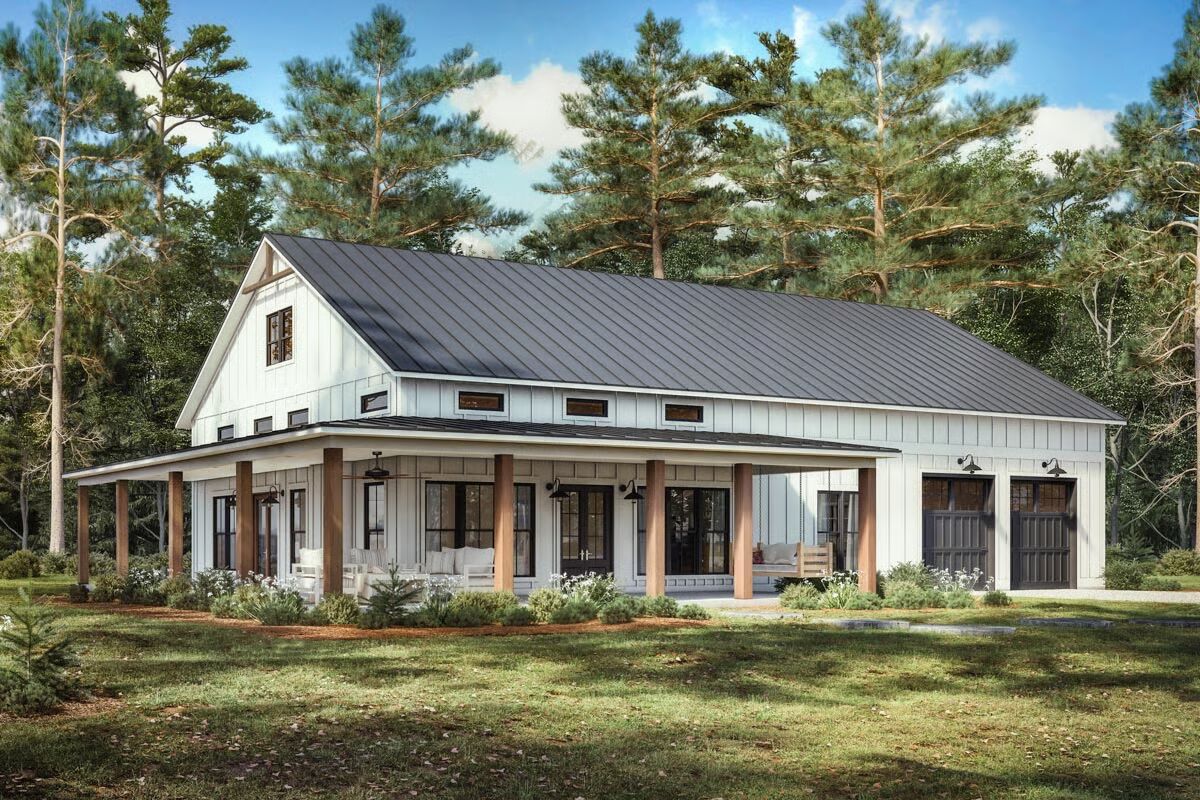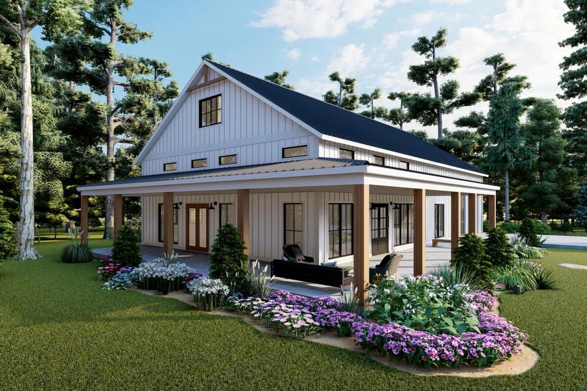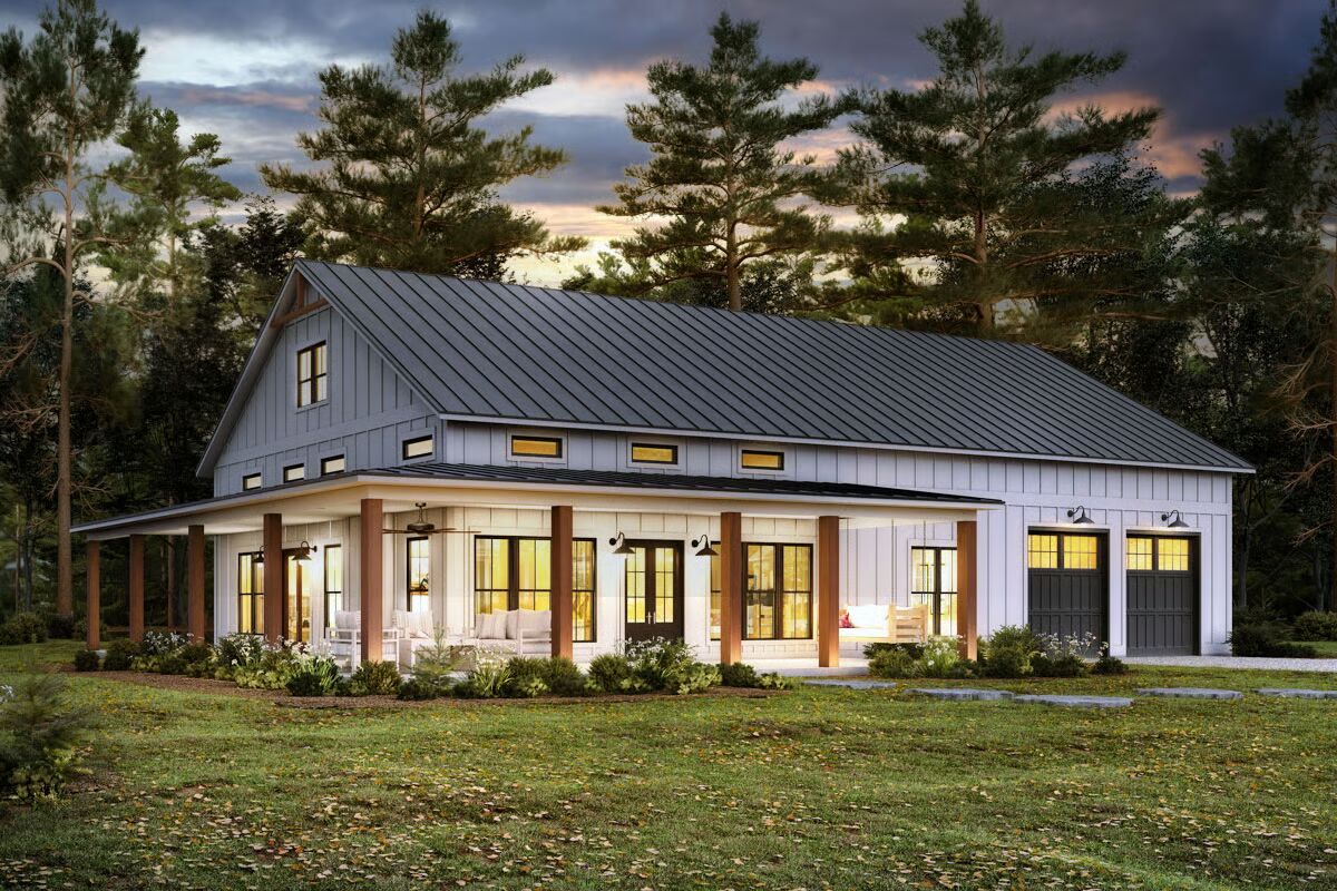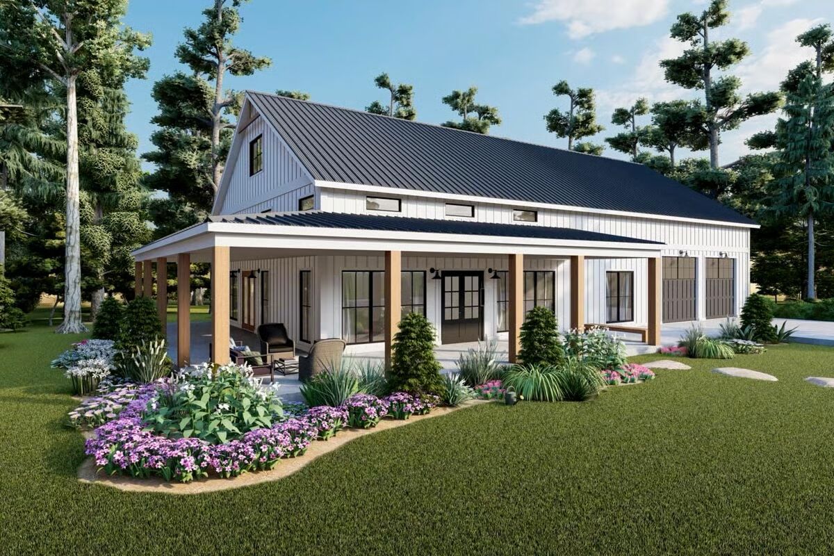 This barndominium-style home combines modern efficiency with rustic charm, highlighted by a spacious 10β4β-deep wraparound porch spanning two sides of the property.