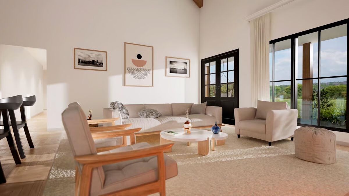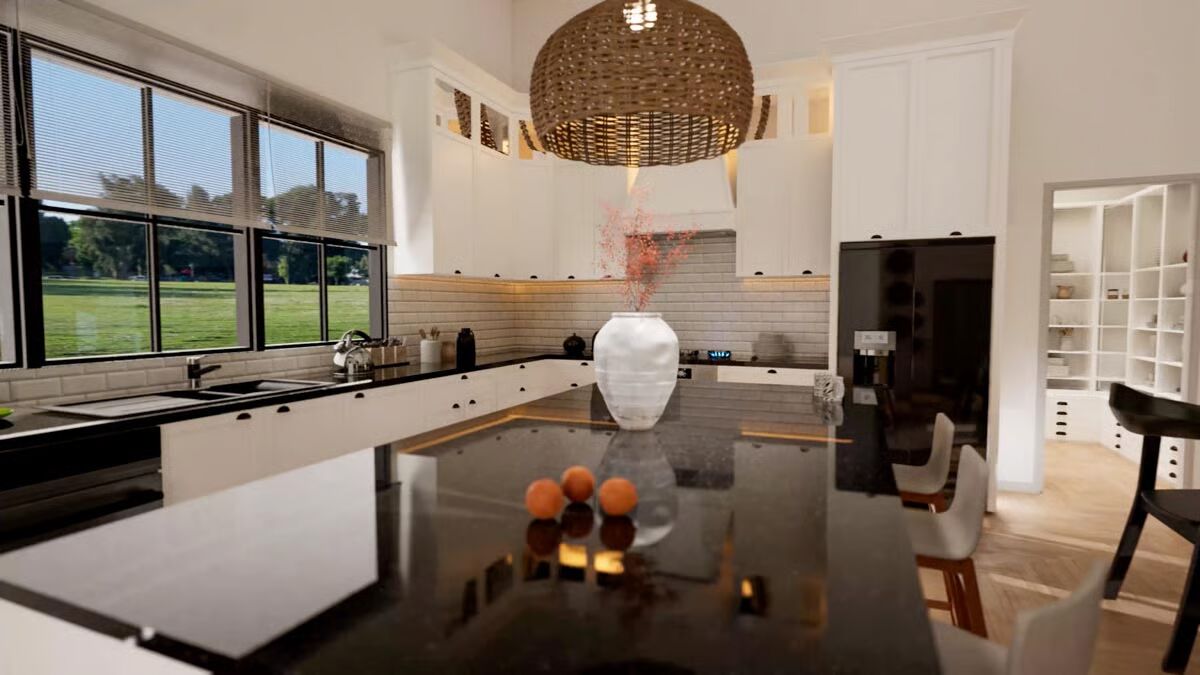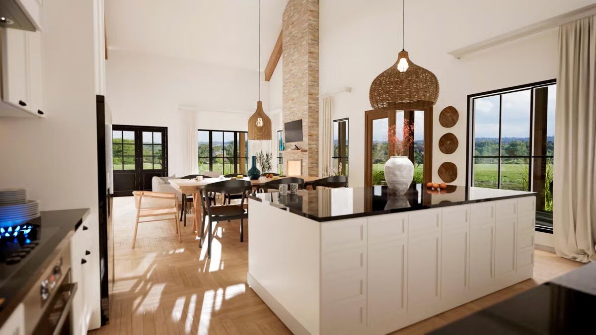 Inside, the open-concept design showcases a great room with fireplace, dining area, and a chefβs kitchen featuring a 9β x 4β island and walk-in pantry, all set beneath soaring 16β ceilings with large windows that flood the space with natural light.