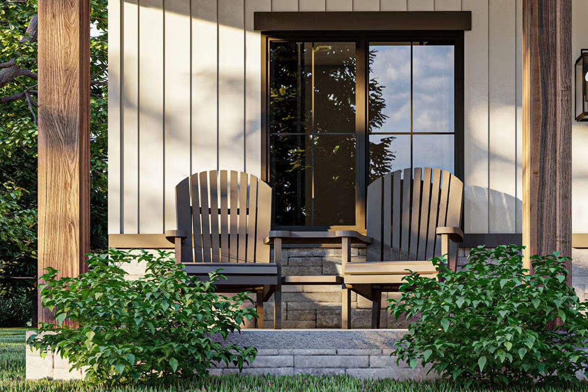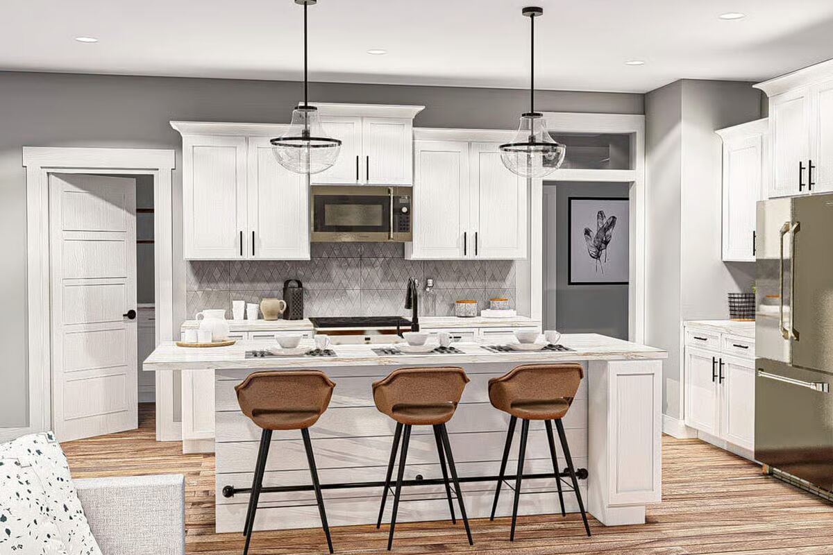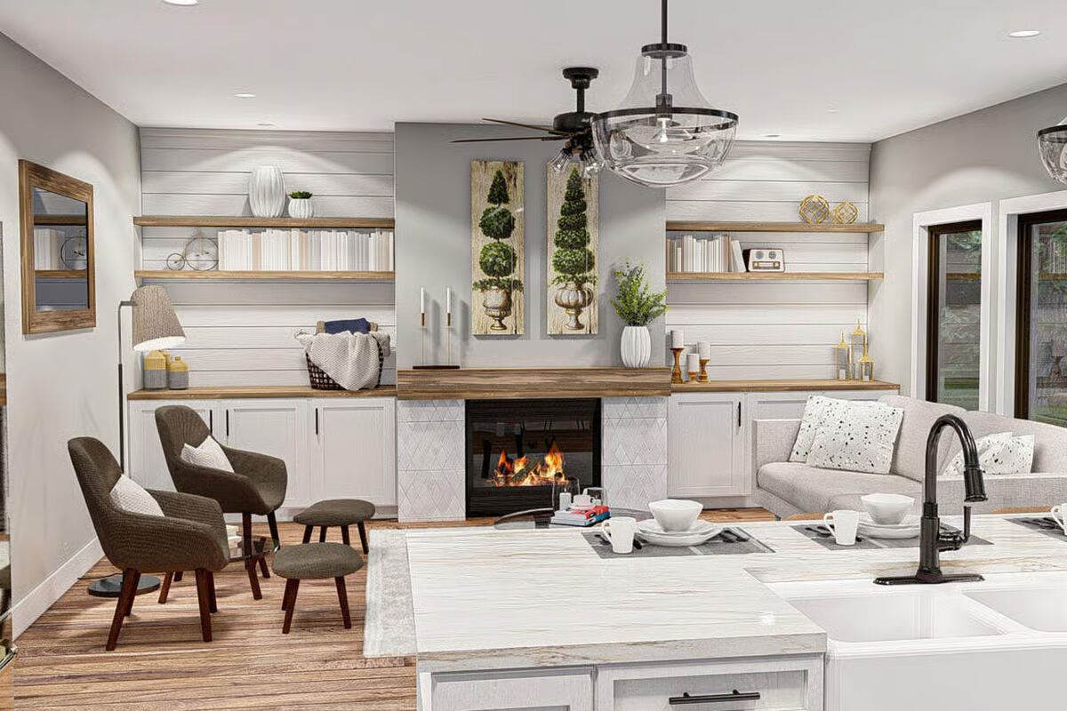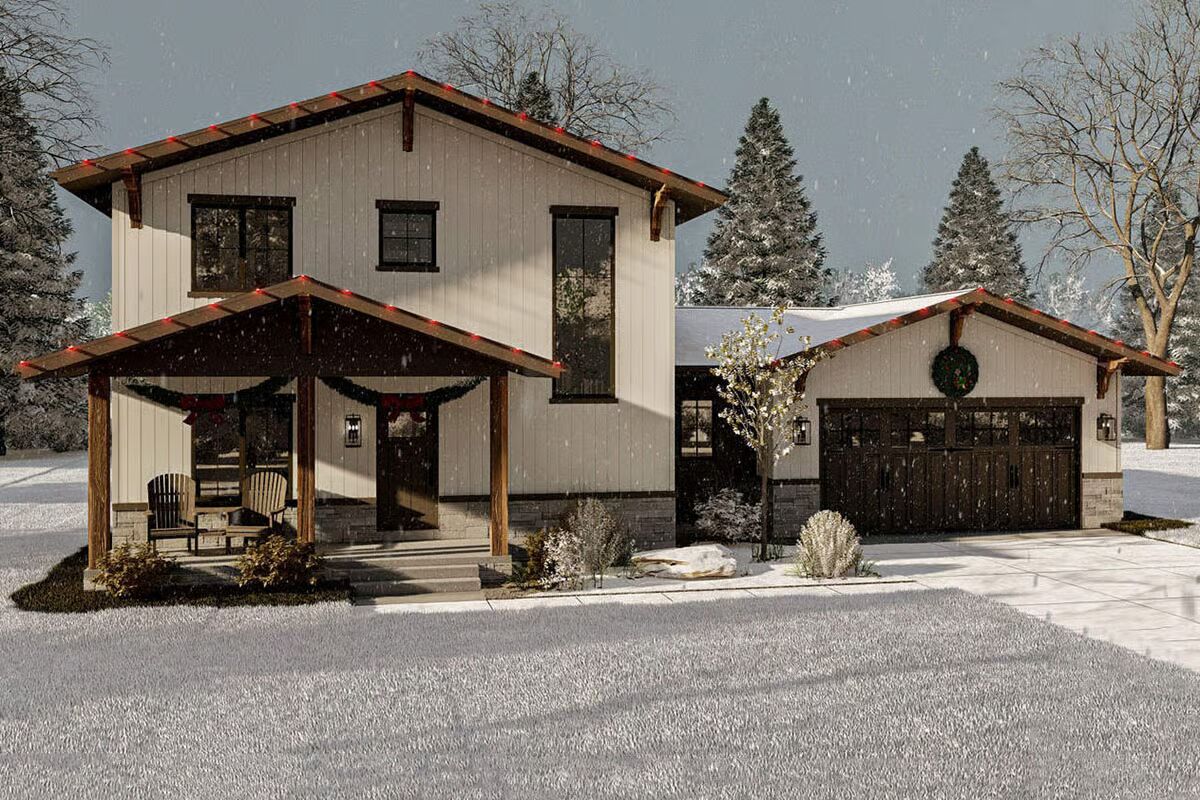 Buy This PlanThis home’s front elevation showcases a combination of white vertical siding and a gray stone wainscot.The house is decorated for the holidays, with garlands on the front porch and a wreath on the garage.This image captures the rear-side of this modern farmhouse. that includes a porch with comfortable seating.This image shows the two-story house from a different angle, highlighting the attached two-car garage.This image shows the front of the home and garage from an angle, emphasizing its integrated design that shares the same siding, stone foundation, and dark roof.This is a close-up shot of the front porch area. Two dark Adirondack-style chairs sit on a small landing with stone siding. The kitchen space features white shaker-style cabinets and a large kitchen island with a white countertop and a shiplap-style front.\This image shows the warm and inviting living room, where a prominent fireplace with a light-colored tile surround and a wood mantel is the focal point.