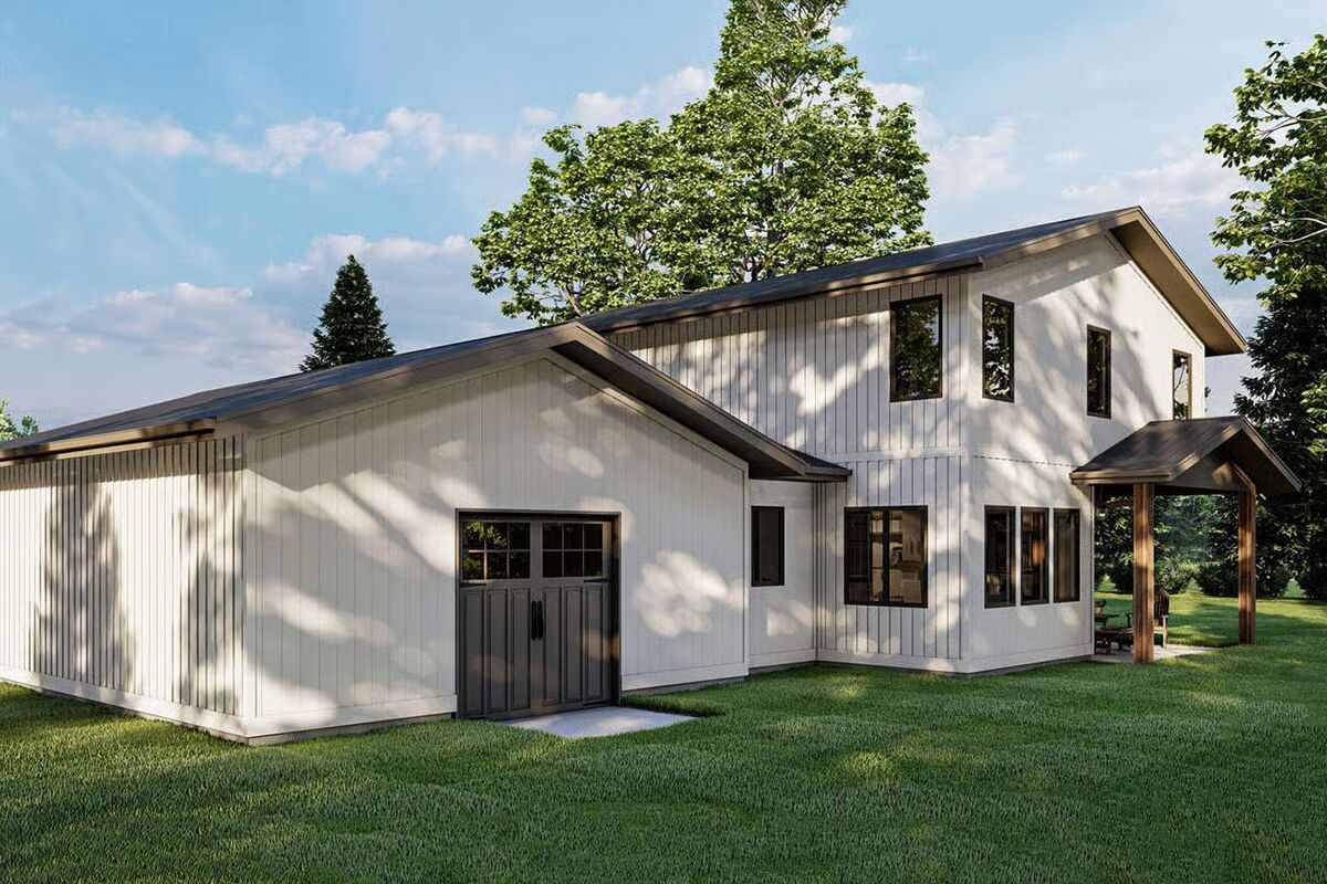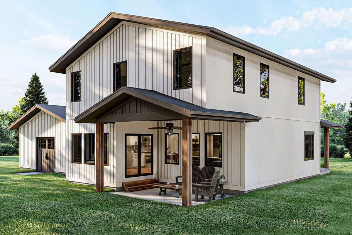 This 3-bedroom, 2-story barndominium-style home blends timeless farmhouse charm with modern functionality. Its striking curb appeal comes from the elegant contrast of siding colors, complemented by wood and stone accents.