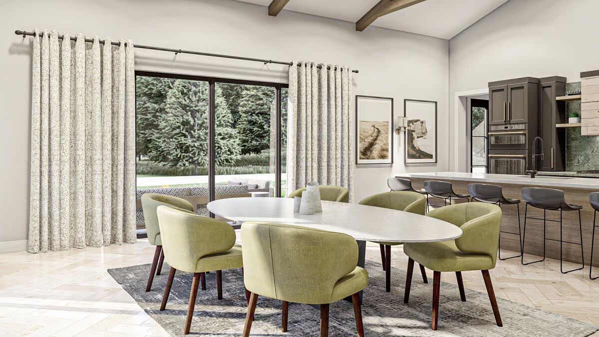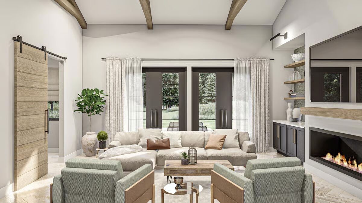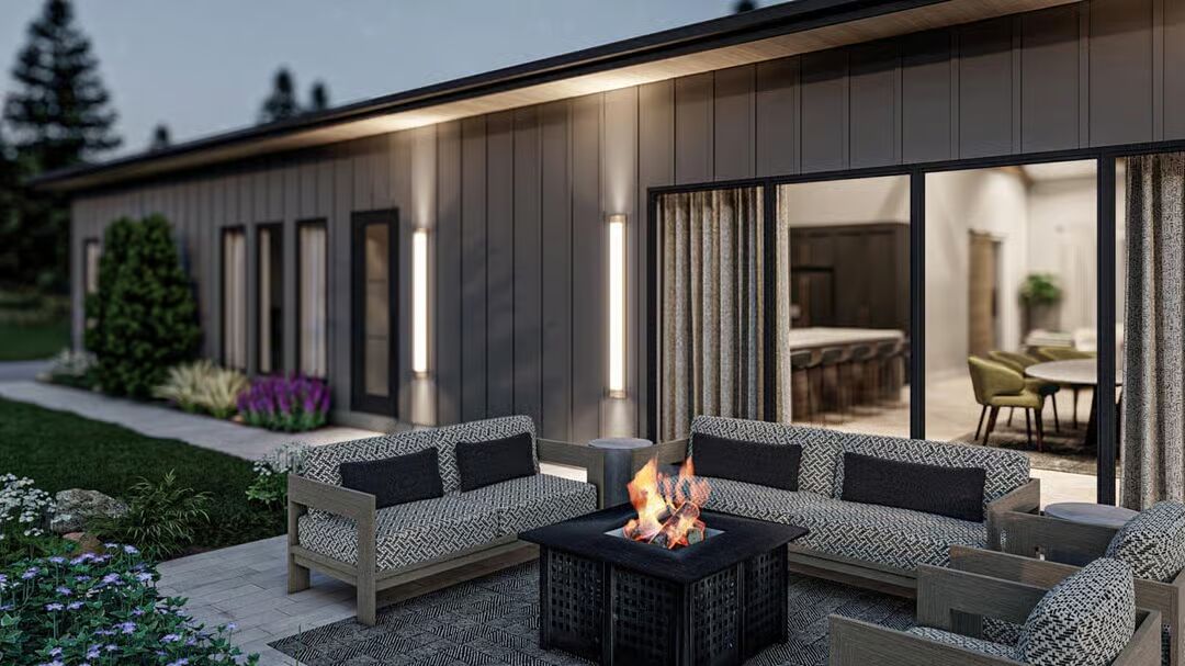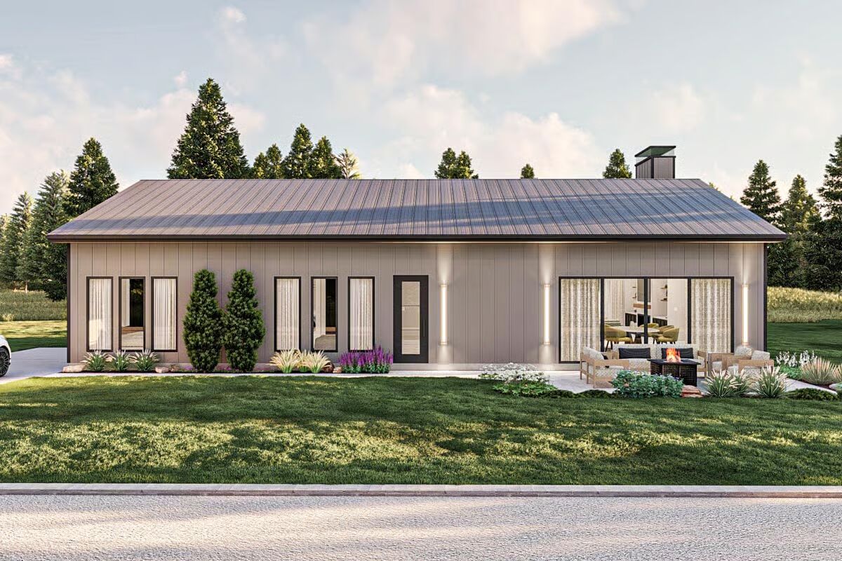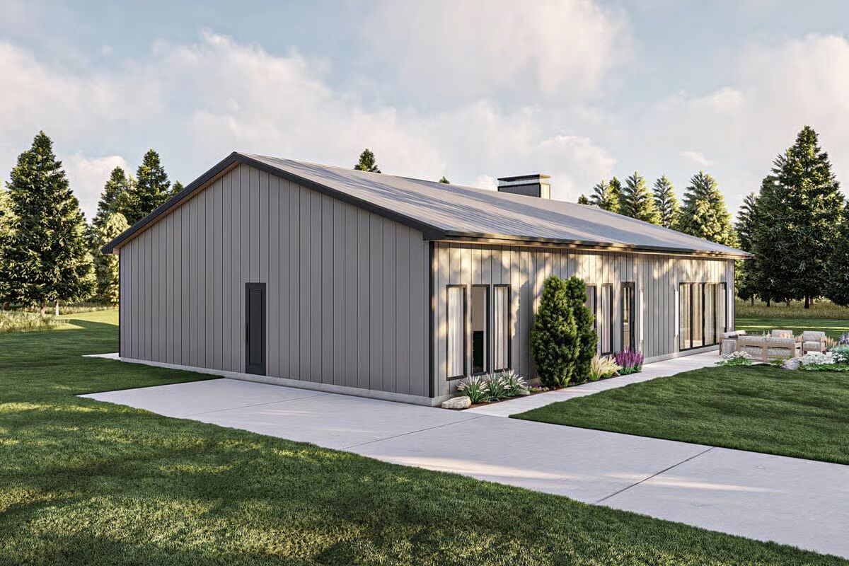 Buy This PlanThis overhead floor plan illustrates the spacious and functional layout, connecting living areas to private bedrooms.This Barndominium offers a perfect blend of rustic and modern design with a backyard patio ready for relaxing or entertaining.The sleek, modern facade of this Barndominium features a low-profile roof and an inviting outdoor fire pit area.Clean lines and a vertical metal siding define the modern Barndominium silhouette, set against a backdrop of mature trees.The backside of the Barndominium showcases multiple exits to the patio areas for seamless indoor-outdoor living.An alternate view of the Barndominium highlights a charming outdoor dining nook for alfresco meals.The patio transforms into a cozy evening lounge with a warm fire pit and modern vertical wall lights.The open-concept dining and kitchen area is anchored by vaulted ceilings and stylish timber truss beams.Enjoy a bright, airy meal in the dining space that features eye-catching olive green accent chairs and a view of the outdoors.The living room centers around a modern fireplace and built-in shelving, creating a sophisticated and cozy atmosphere.A sliding barn door adds a touch of rustic charm to the bright living area, which opens out to the beautiful landscape.The contemporary kitchen features dark cabinetry, an extended kitchen island, and a distinctive, patterned backsplash.Elegant dark cabinetry and rose gold accents make this a high-end chef’s kitchen with plenty of storage and counter space.The dual home office is a stylish workspace featuring floating shelves and a trendy geometric accent wall.This serene bedroom offers a tranquil retreat with a dramatic olive-green vertical panel accent wall.The luxurious primary bathroom is a spa-like oasis with dual vanities, a deep soaking tub, and a window framing the woods.