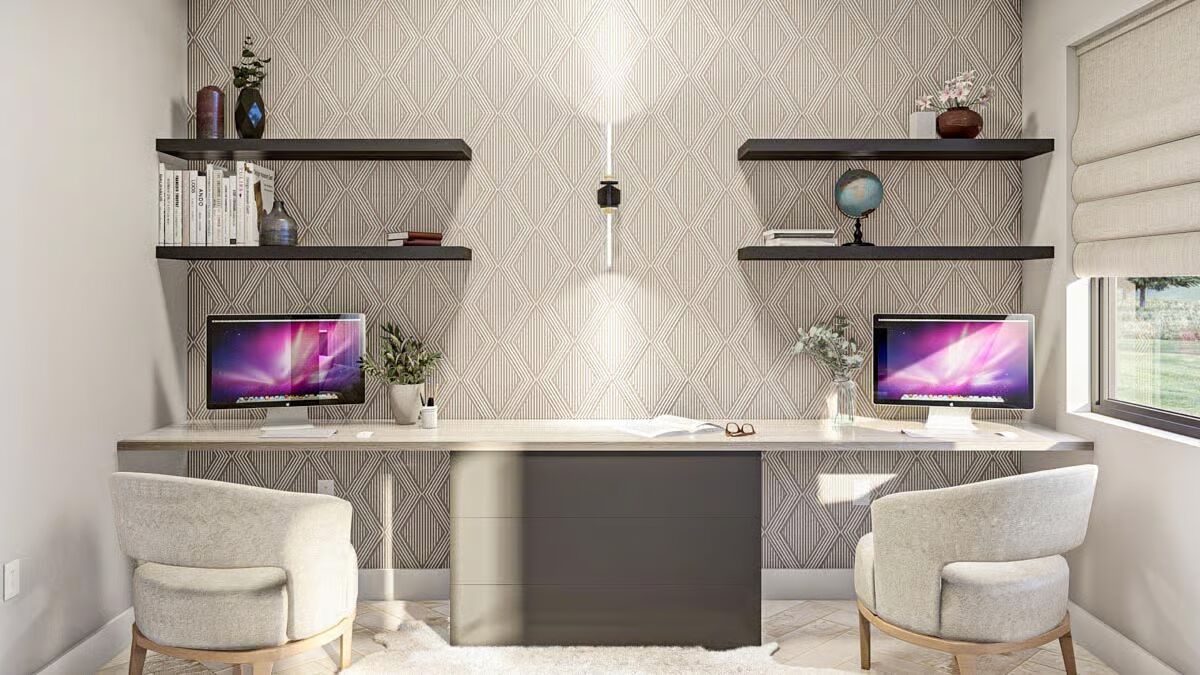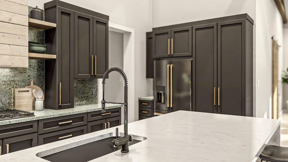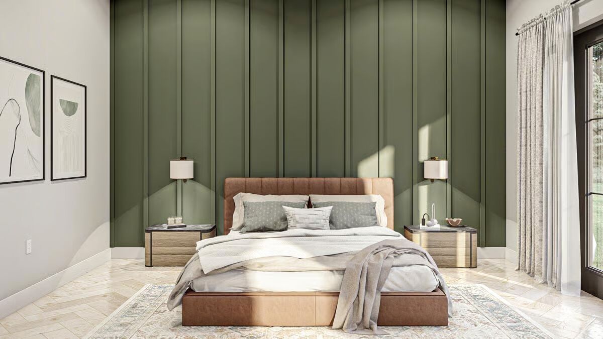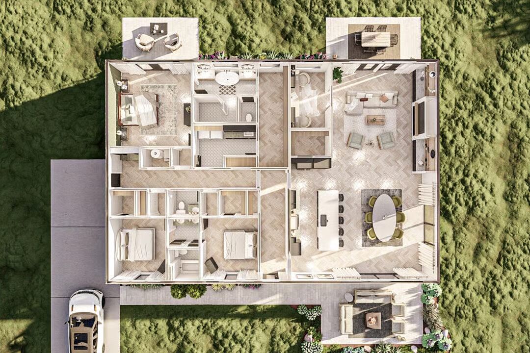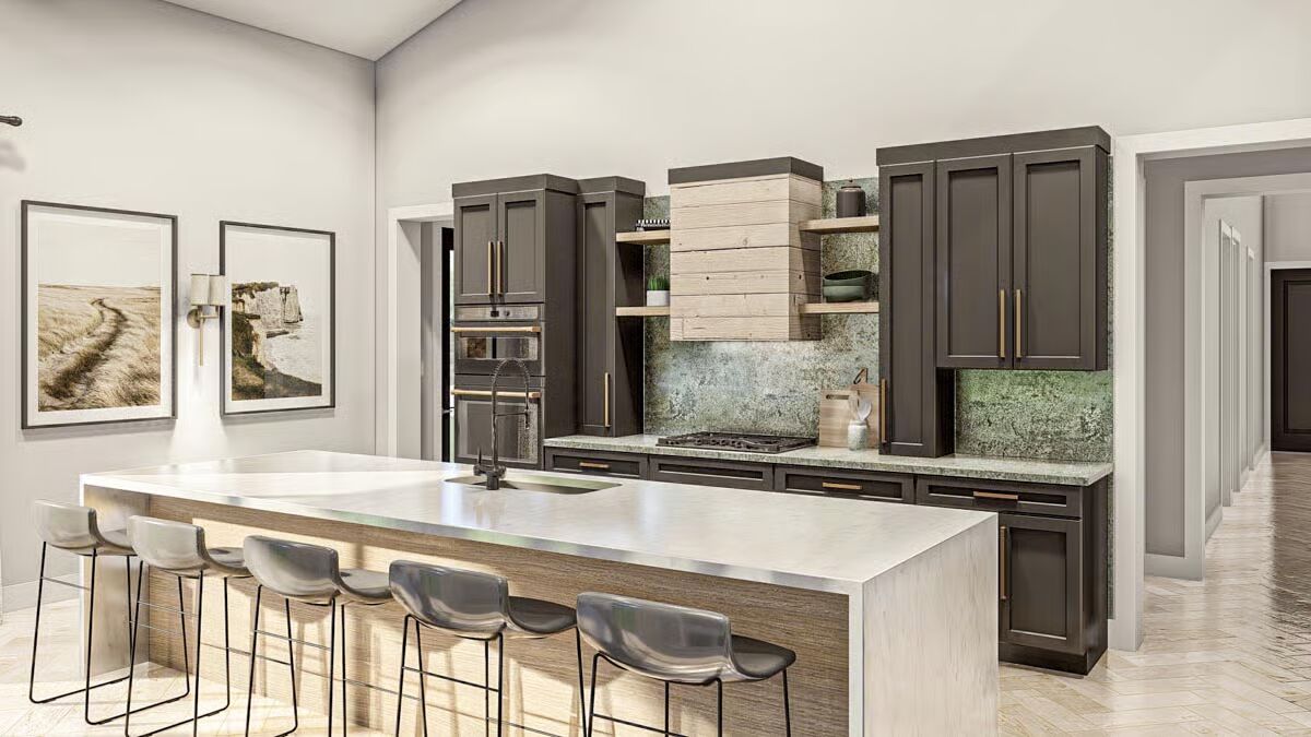 Buy This PlanThis overhead floor plan illustrates the spacious and functional layout, connecting living areas to private bedrooms.This Barndominium offers a perfect blend of rustic and modern design with a backyard patio ready for relaxing or entertaining.The sleek, modern facade of this Barndominium features a low-profile roof and an inviting outdoor fire pit area.Clean lines and a vertical metal siding define the modern Barndominium silhouette, set against a backdrop of mature trees.The backside of the Barndominium showcases multiple exits to the patio areas for seamless indoor-outdoor living.An alternate view of the Barndominium highlights a charming outdoor dining nook for alfresco meals.The patio transforms into a cozy evening lounge with a warm fire pit and modern vertical wall lights.The open-concept dining and kitchen area is anchored by vaulted ceilings and stylish timber truss beams.Enjoy a bright, airy meal in the dining space that features eye-catching olive green accent chairs and a view of the outdoors.The living room centers around a modern fireplace and built-in shelving, creating a sophisticated and cozy atmosphere.A sliding barn door adds a touch of rustic charm to the bright living area, which opens out to the beautiful landscape.The contemporary kitchen features dark cabinetry, an extended kitchen island, and a distinctive, patterned backsplash.Elegant dark cabinetry and rose gold accents make this a high-end chef’s kitchen with plenty of storage and counter space.The dual home office is a stylish workspace featuring floating shelves and a trendy geometric accent wall.This serene bedroom offers a tranquil retreat with a dramatic olive-green vertical panel accent wall.The luxurious primary bathroom is a spa-like oasis with dual vanities, a deep soaking tub, and a window framing the woods.